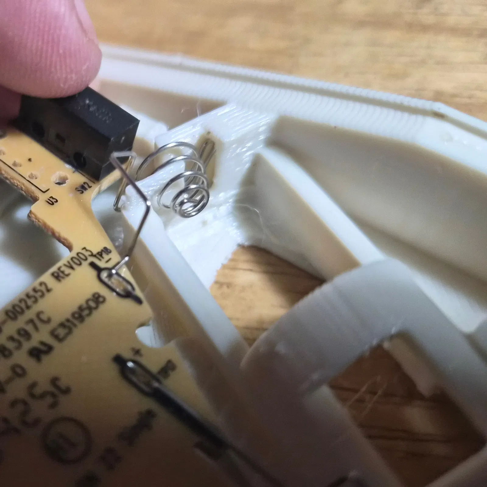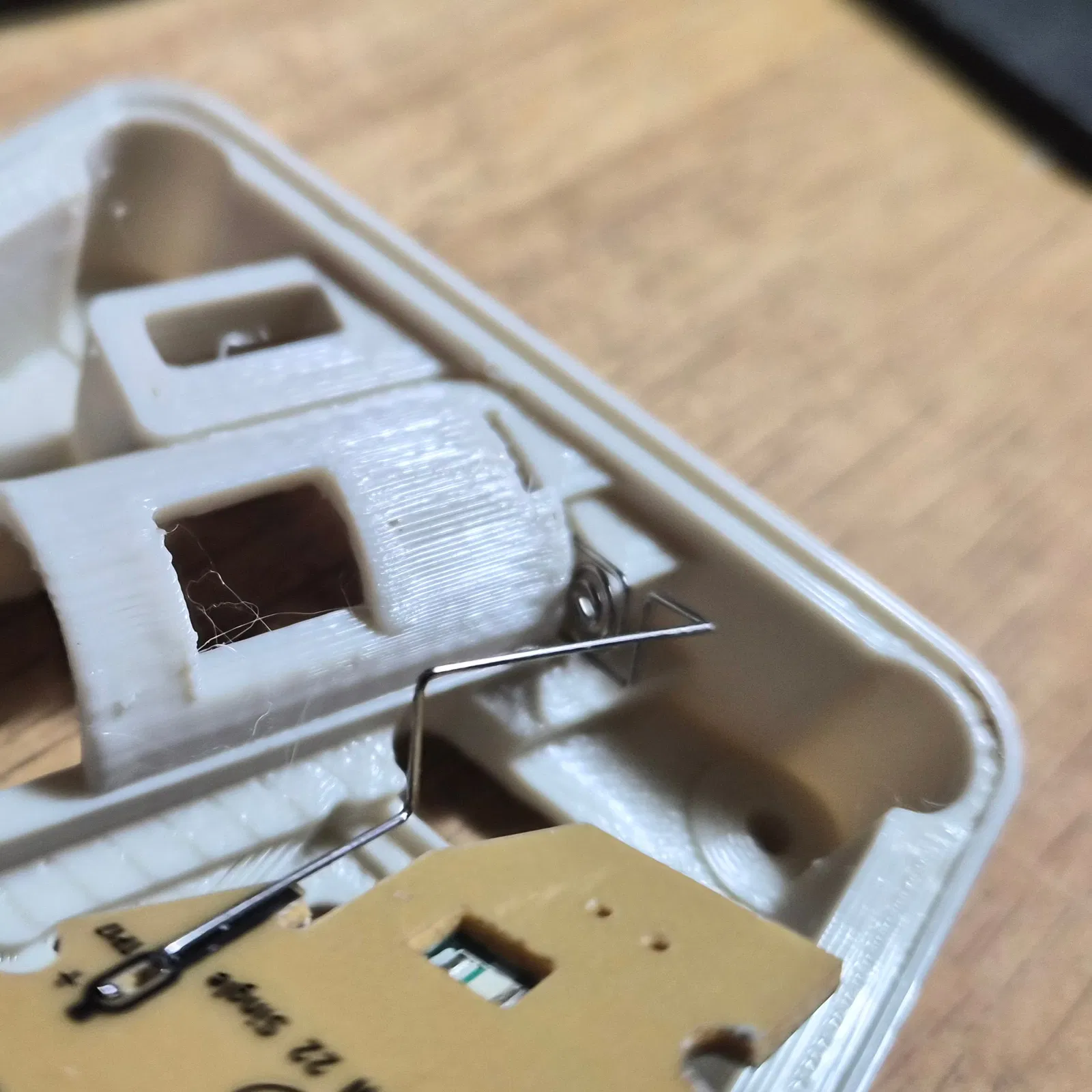 LẮP RÁP: Đặt PCB vào phần đế vừa in, cẩn thận luồn dây điện vào các khe tương ứng xung quanh khay pin. Viên pin sẽ nằm ở góc hơi khác so với M185 gốc nhưng dây điện chỉ cần được đẩy vào đúng vị trí. Dây dương (phía sau chuột) đẩy ngang vào khe, còn lò xo cực âm nhấn xuống khe bên dưới.