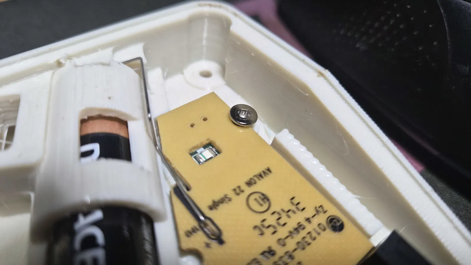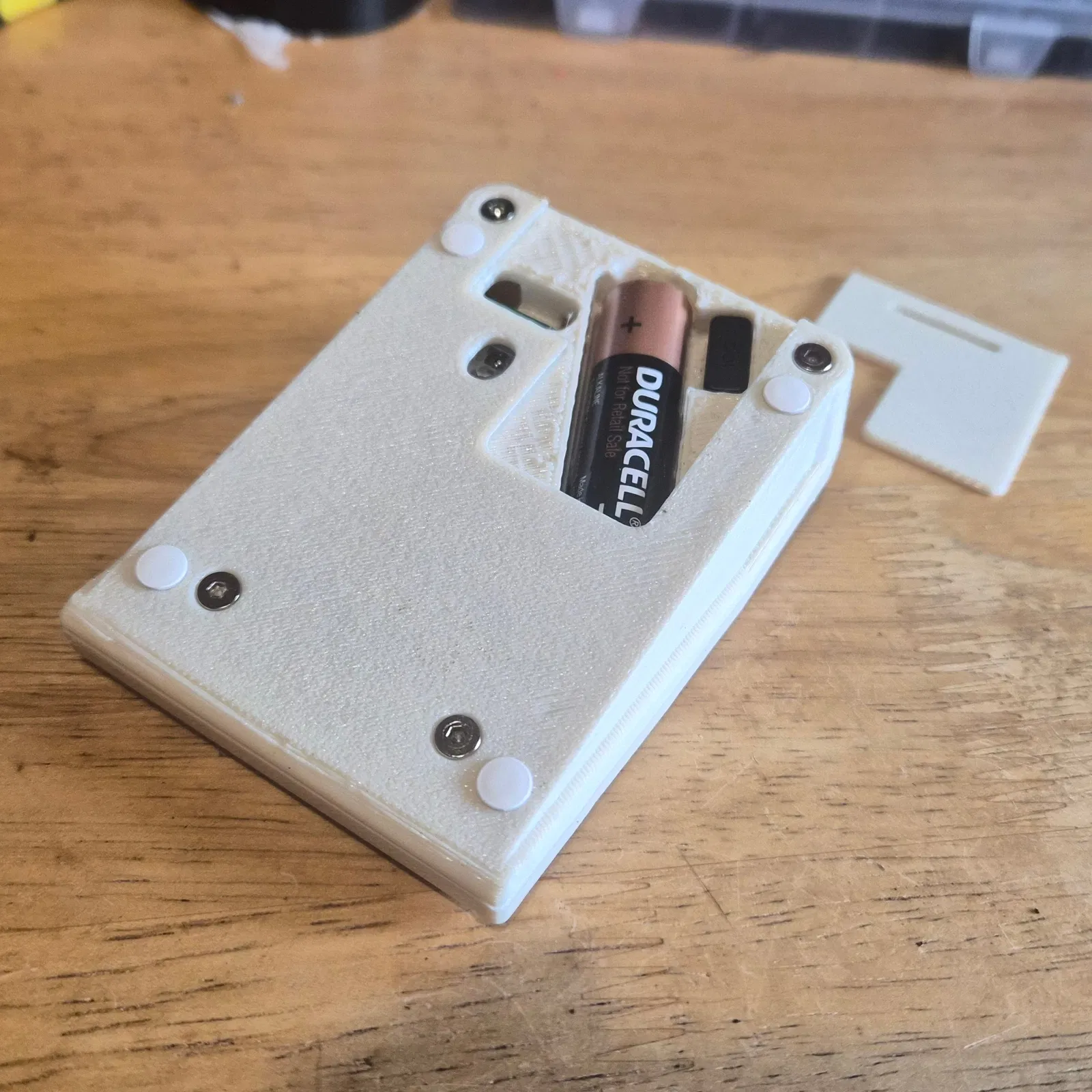 Lắp viên pin AA vào khay bên dưới và trượt nắp pin mới vào. Nó chỉ khớp theo một chiều duy nhất. Bên trong có sẵn chỗ để cất đầu thu USB nếu cần. Mình chưa tìm được cách đặt nút nguồn chính xác, nên tạm thời để công tắc PCB lộ ra ở mặt dưới, bạn có thể thao tác bằng đầu bút chì nhọn hoặc góc của nắp pin.