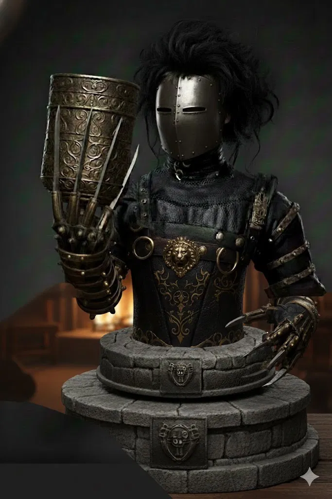 Thiết kế đẳng cấp: Tượng bán thân chi tiết lấy cảm hứng từ bộ giáp thời trung cổ và mặt nạ sắt huyền thoại, mang lại vẻ ngoài đầy bí ẩn và quyền năng cho không gian phòng tắm của bạn.