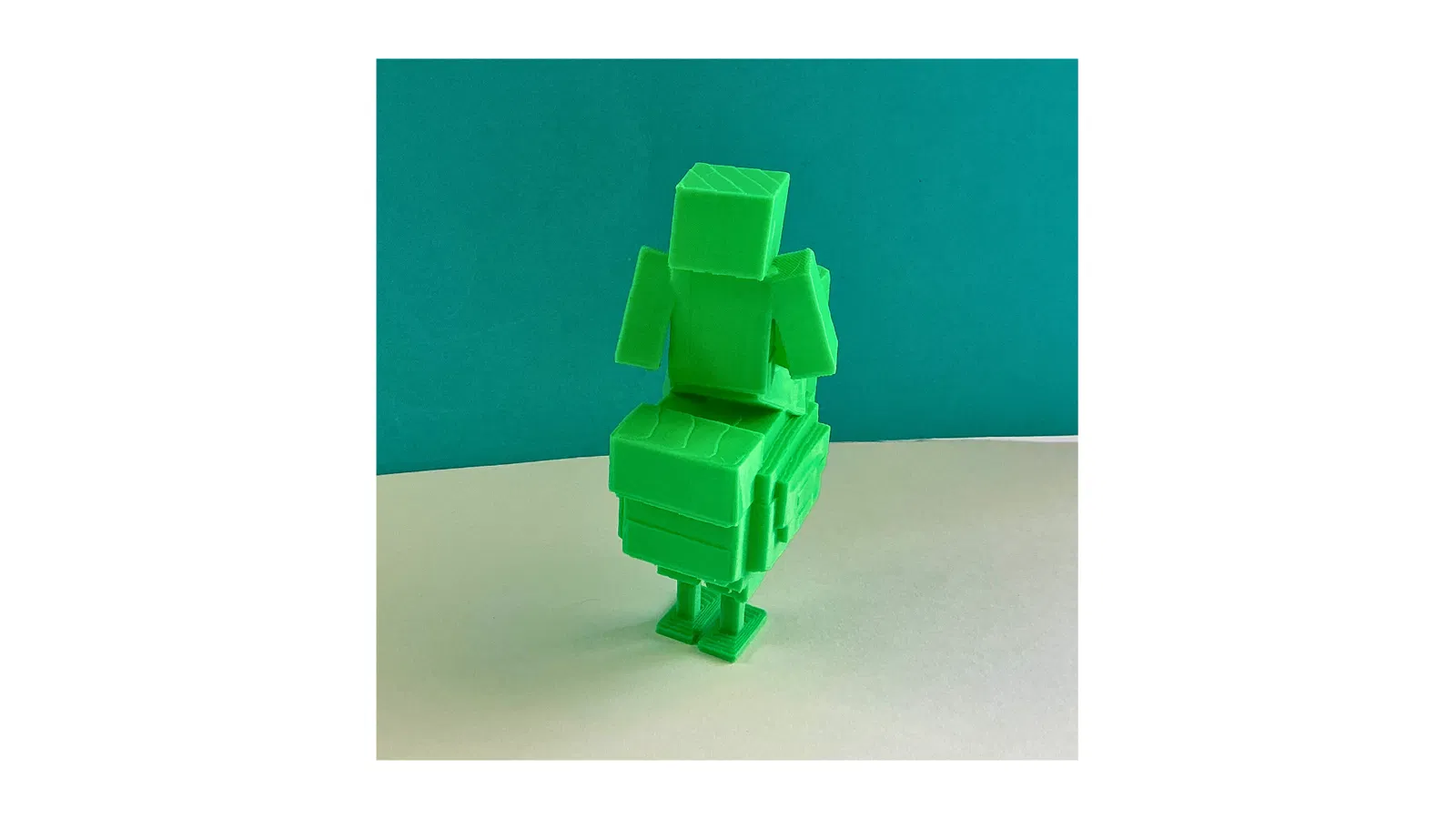 Mô hình làm nổi bật hình khối đặc trưng của nhân vật, với đôi tay dài buông thõng trên đầu gối và phần thân hình chữ nhật vững chãi. Việc tích hợp thêm chiếc rương làm đế tạo nên một yếu tố kể chuyện thú vị, biến đây thành dự án hoàn hảo để trình diễn các loại nhựa in (filament) hai tông màu đầy sống động, giúp bắt sáng cực tốt trên những bề mặt phẳng phiu, đậm chất kiến trúc.