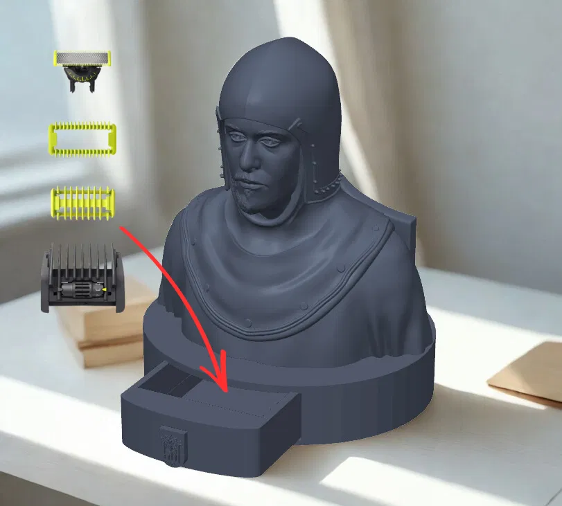 Mang bầu không khí thời Trung cổ vùng Bohemia vào bàn làm việc hoặc kệ phòng tắm của bạn. Mẫu giá đỡ độc đáo này dành cho Philips OneBlade và các phụ kiện đi kèm được thiết kế lấy cảm hứng từ thế giới của Kingdom Come: Deliverance II – thô mộc, chân thực và đầy những chi tiết tinh xảo.