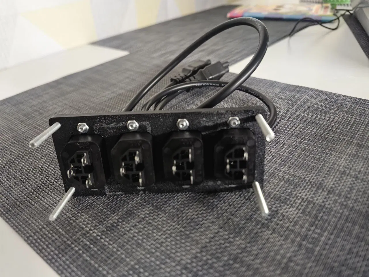 Bộ gom dây nguồn cho 4 cổng chuẩn C13/C14. Thiết kế được cố định bằng ốc vít đầu bằng 90 độ. Bạn dùng vít dài 12mm, vít ngắn 5-6mm, tất cả đều dùng đai ốc thông thường. Vào phần khung máy thì gắn bằng bu-lông M5/M6 thông qua T-nut. Có thể dùng thêm vòng đệm (long-đền) để tăng độ dày và cố định chắc chắn hơn.