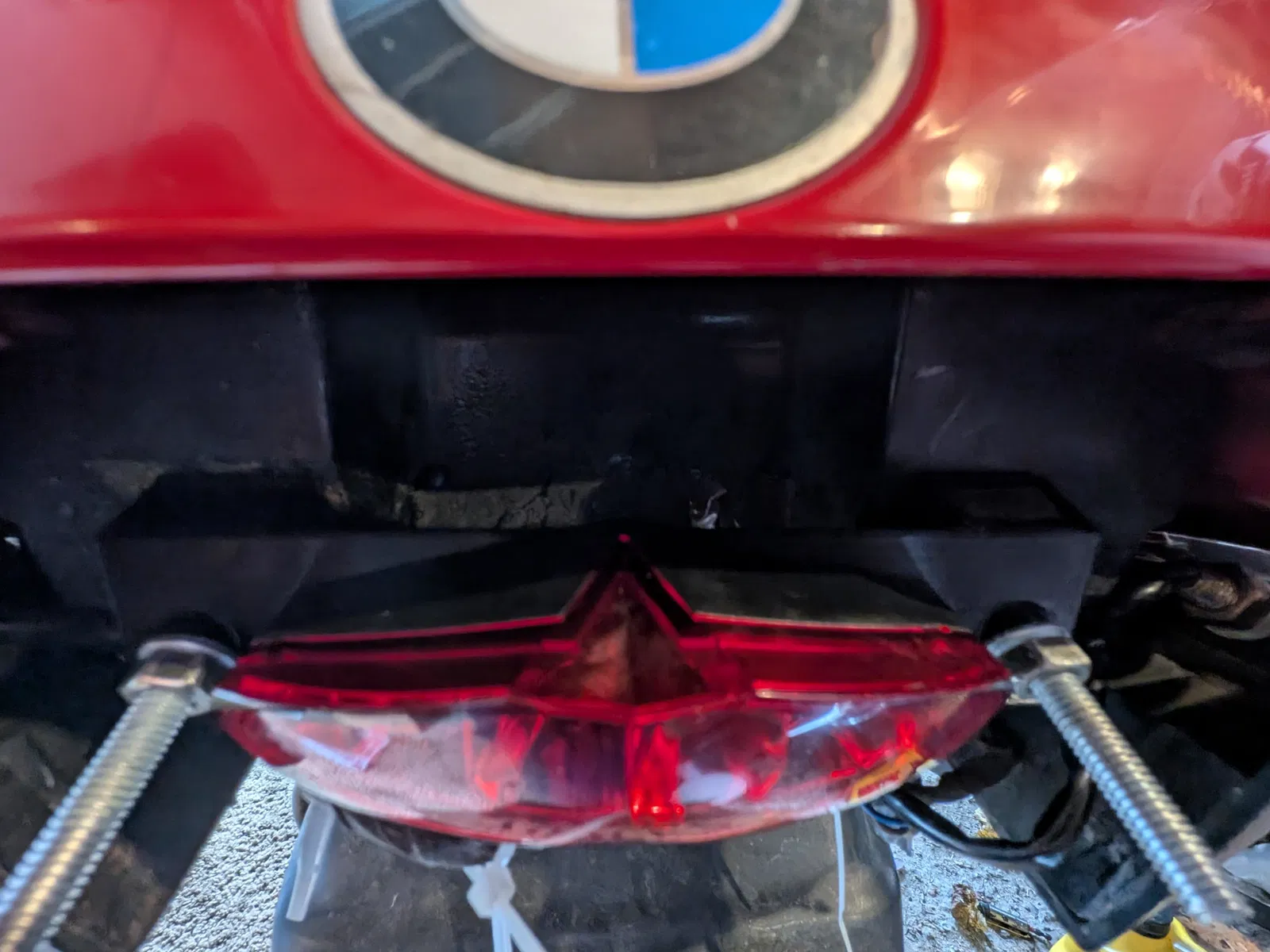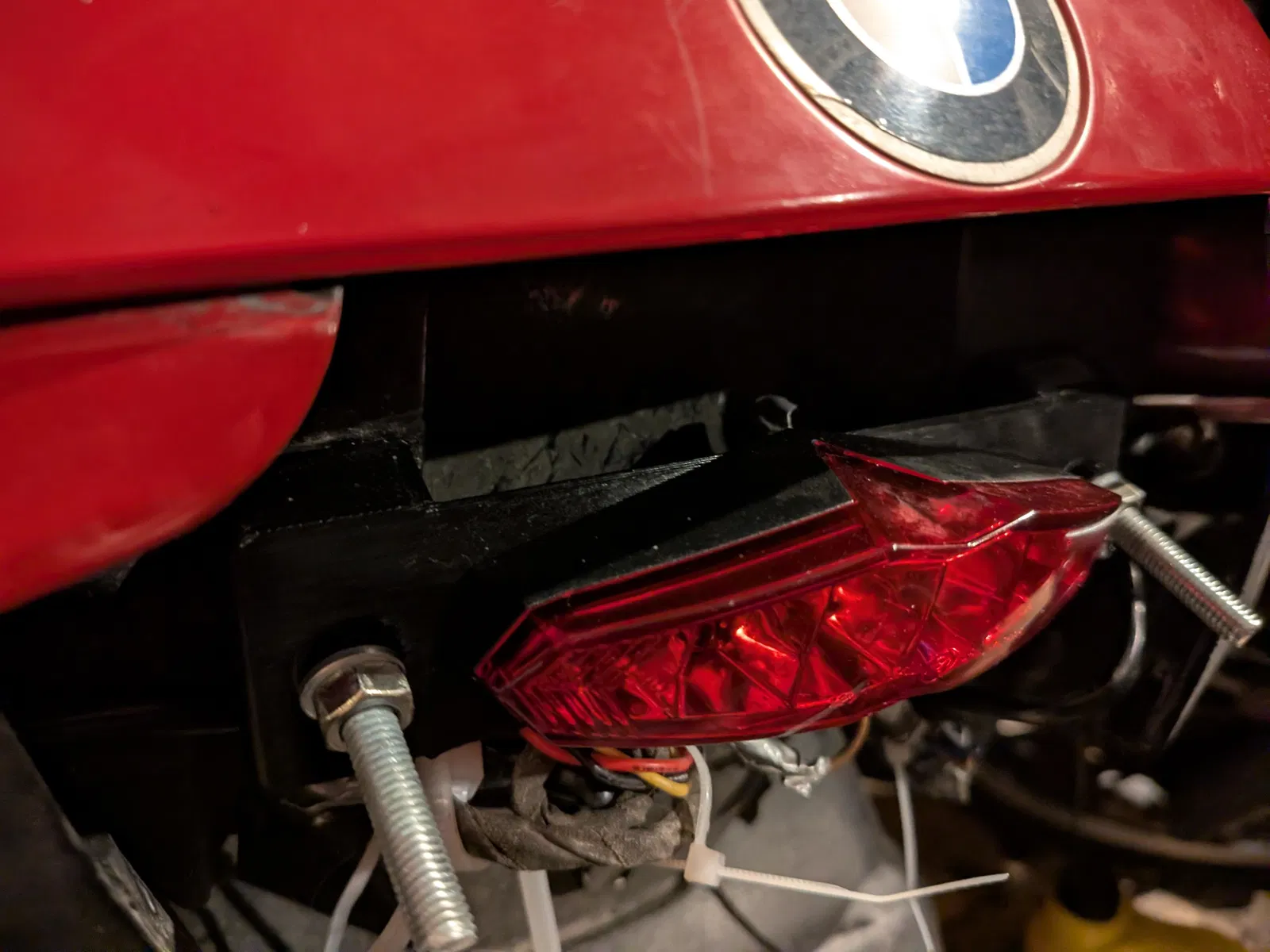 Sau khi cái đèn hậu zin trên xe mình rụng mất tiêu trong một chuyến đi xa (BMW mà dùng mấy con ốc nhựa kiểu đó hả trời?), mình quyết định đổi sang dùng đèn hậu LED đa năng Koso Infinity (https://kosonorthamerica.com/product/infinity-led-taillight-red/) vì đơn giản đó là cái đèn rẻ nhất trên Revzilla lúc đó. Vấn đề là vị trí gắn trên xe bị nghiêng xuống khoảng 25 độ, nên nếu gắn đèn thẳng vào thì nó sẽ chiếu xuống đất nhiều hơn là báo hiệu cho xe sau (và làm đèn soi biển số gần như vô dụng).