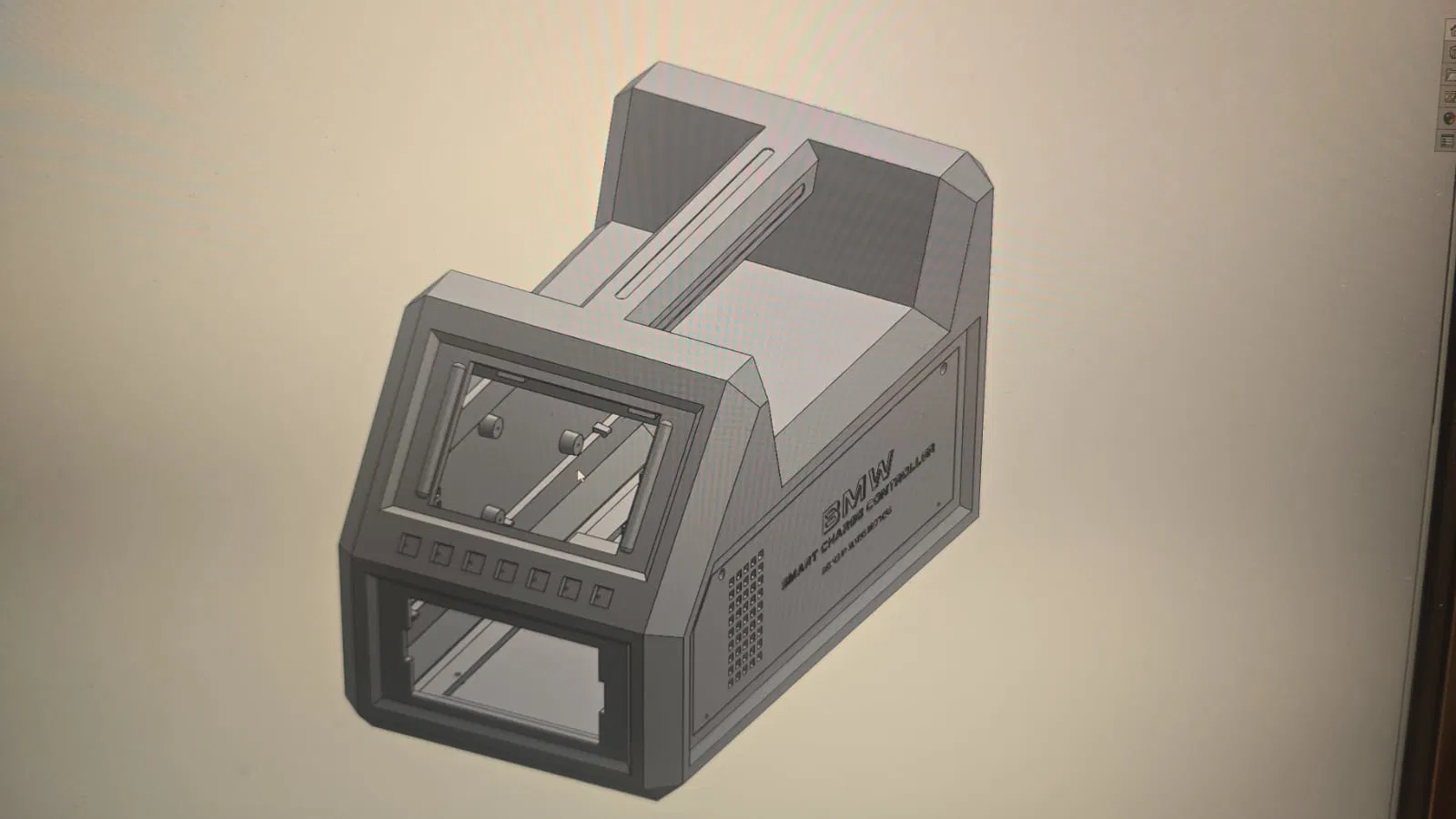 Đây là mẫu vỏ hộp tùy chỉnh cho dự án sạc thông minh BMW tự chế (DIY). Thiết kế bao gồm một cửa sổ hiển thị phía trước, các khe hở cho nút bấm, tấm ốp bên hông và tay cầm tích hợp phía trên để thuận tiện khi mang vác.