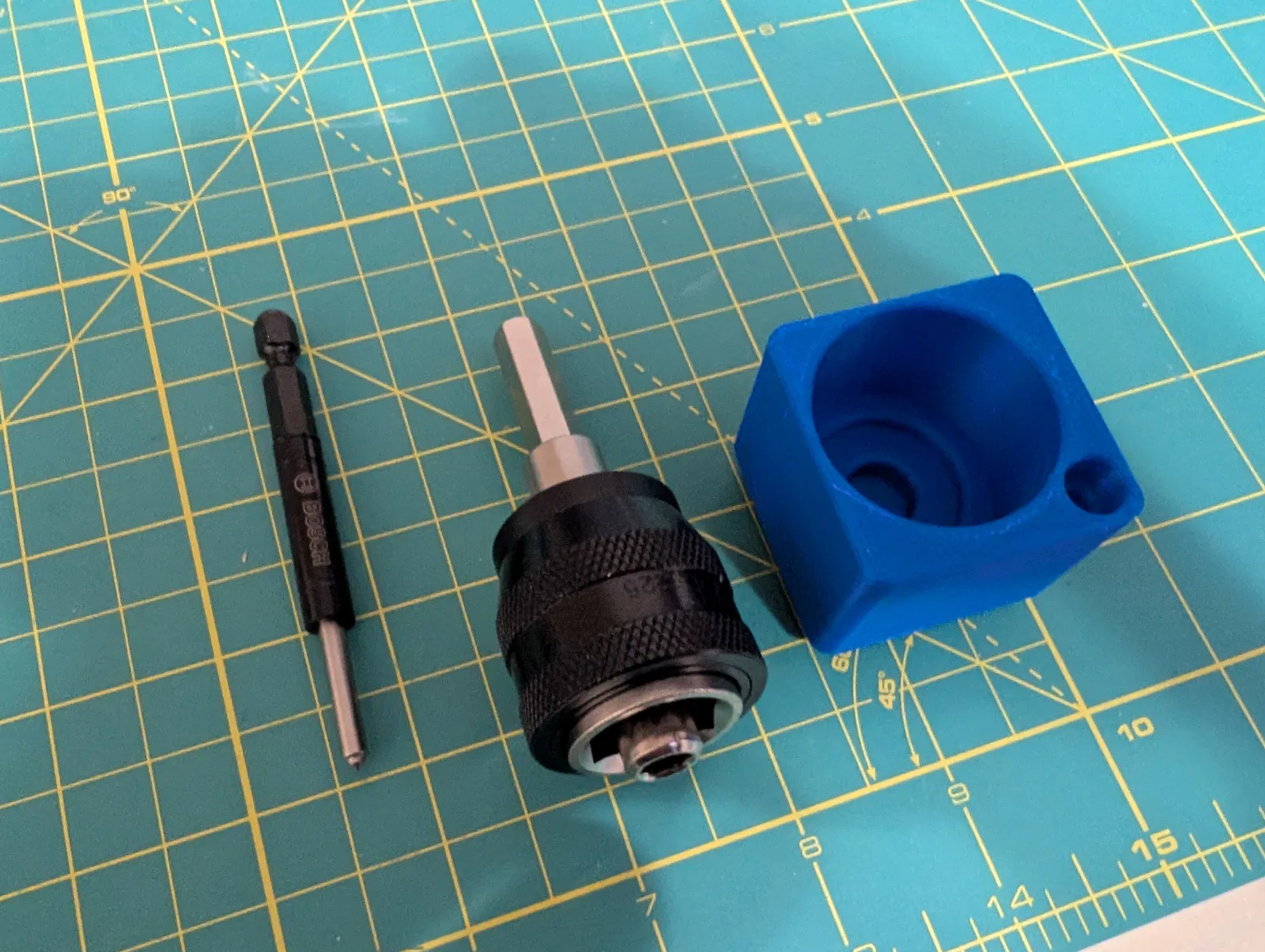 Thiết kế được tối ưu hóa với một khoang lớn để đặt trục gá chính và một lỗ nhỏ bên cạnh để cắm mũi khoan tâm (pilot bit), đảm bảo mọi linh kiện quan trọng của bộ Bosch HDGQA đều nằm gọn trong một khối duy nhất. Dưới đây là những đặc điểm nổi bật và lưu ý khi bạn in mẫu này: