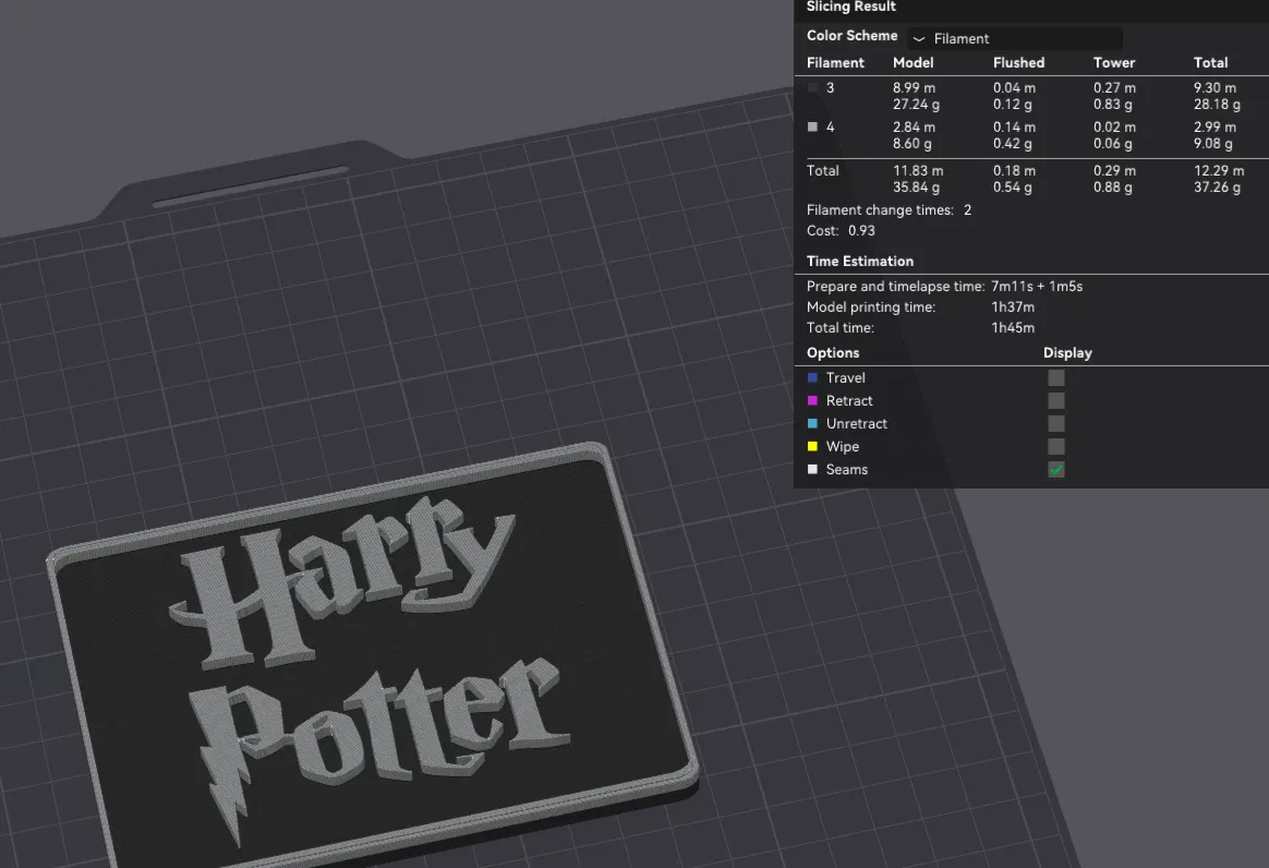 - Kỹ thuật in: Sử dụng kỹ thuật thay đổi màu nhựa (filament change) ở các lớp nhất định để tạo hiệu ứng nổi bật cho dòng chữ "Harry Potter".