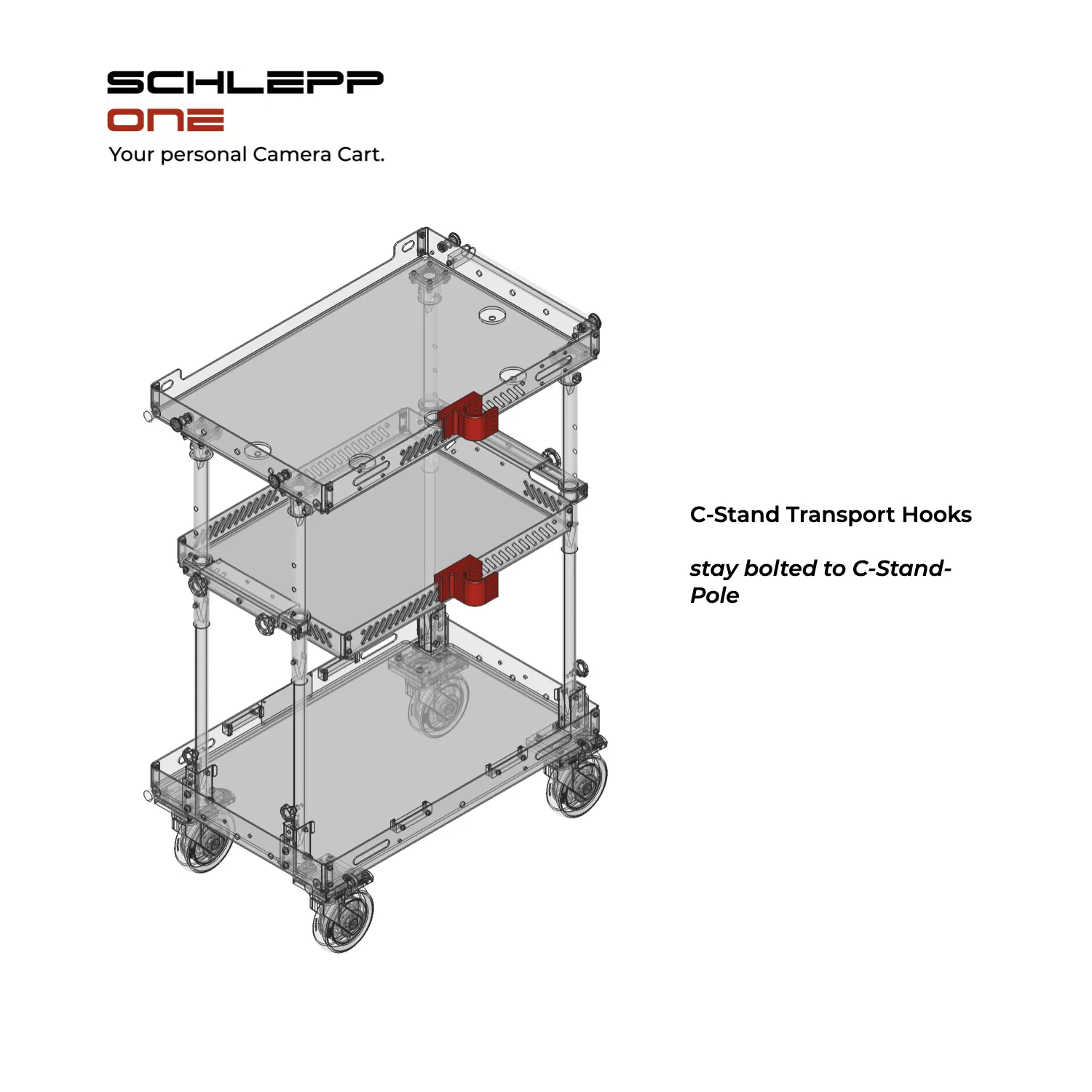 Chỉ cần gắn hai bộ phận này vào chân C-Stand và móc chúng vào phần gờ của kệ trên xe đẩy SCHLEPP ONE hoặc SCHLEPP ONE-S để vận chuyển dễ dàng!