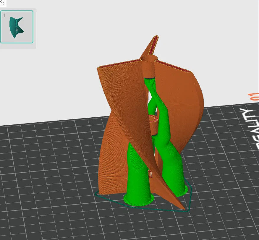 Support (Quan trọng!): Có. Như trong ảnh, mình khuyên dùng tree supports để đỡ các phần nhô ra ở giữa và phần bắt đầu của cánh quạt mà không tốn quá nhiều nhựa hay làm hỏng bề mặt chi tiết.