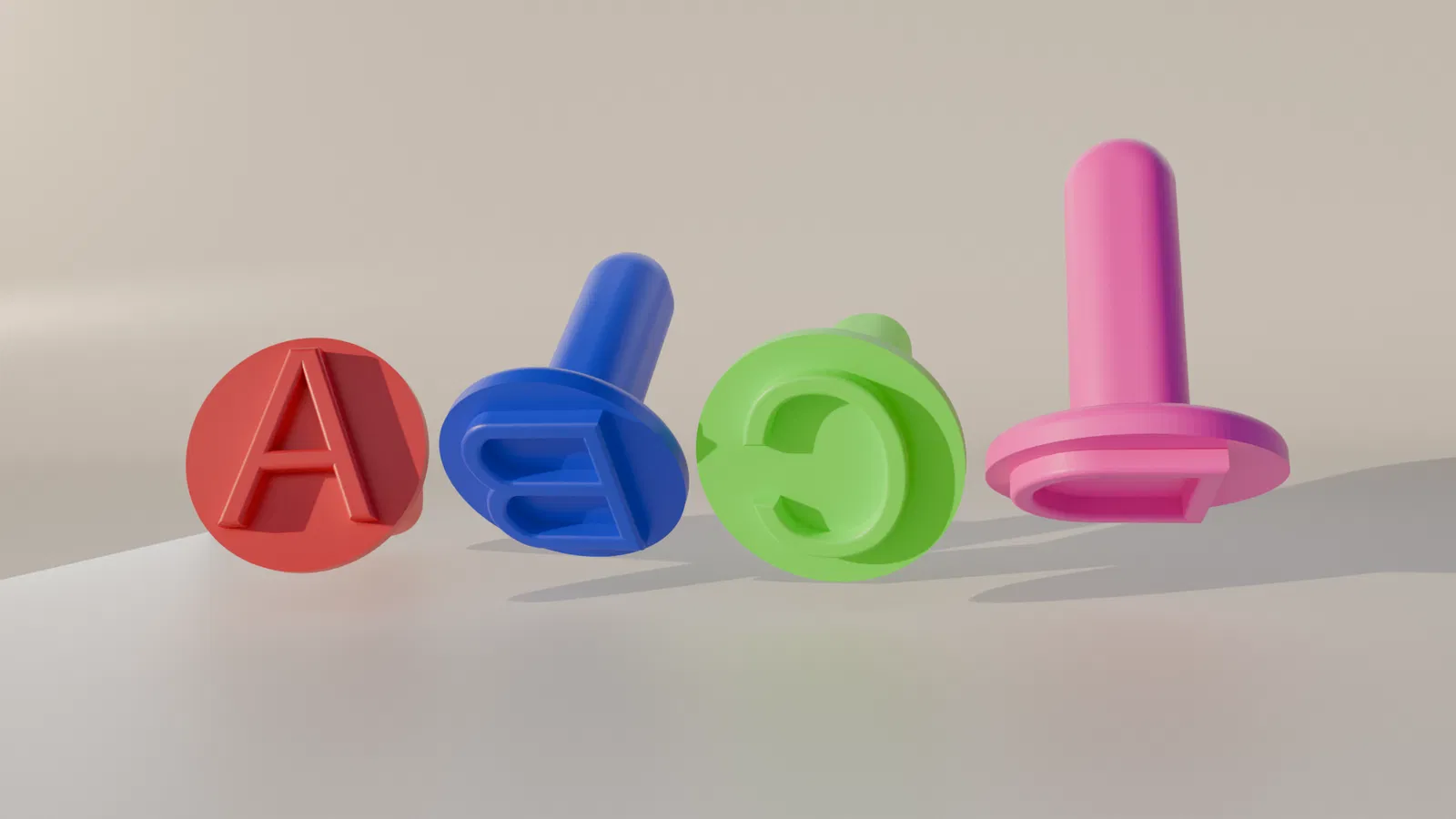 Bộ 4 con dấu bao gồm các chữ cái A, B, C và D. Bạn có thể dùng các con dấu này để in màu, chơi cùng cát động lực hoặc rất nhiều hoạt động sáng tạo khác! Phần tay cầm có kích thước 60x20mm và phần đế có đường kính 50mm. Bạn cứ thoải mái điều chỉnh kích thước (scale) tùy theo nhu cầu nhé! :)