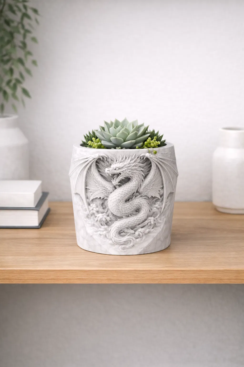 Mang yếu tố giả tưởng đầy ấn tượng vào ngôi nhà với chậu cây hình rồng nổi đầy chi tiết. Thiết kế tối ưu cho in 3D một màu, hoàn hảo để trồng sen đá hoặc làm vật trang trí bắt mắt trên bàn làm việc và kệ sách của bạn.