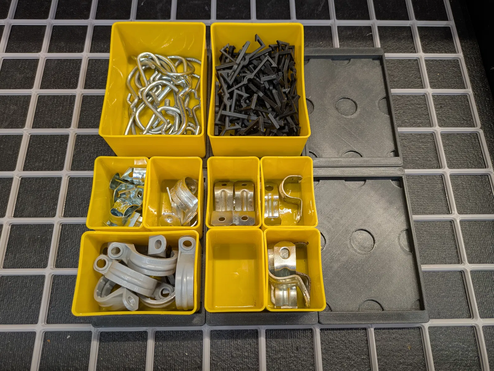 Nhiều người ao ước có một bức tường đựng đồ Sortimo giống như Adam Savage. Nhưng tôi thì đi theo hướng ngược lại: tôi vốn đang đựng ốc vít trong các khay của Harbor Freight và muốn chuyển sang Gridfinity để lấy đồ nhanh hơn và tận dụng hiệu quả các ngăn kéo tủ đồ nghề. Tôi đã in các khay Gridfinity gốc bằng nhựa màu Mango Yellow có gắn tab để dễ nhận diện. Dù rất thích chúng cho những món đồ hay dùng, tôi gặp phải một vấn đề: khi nhìn vào số lượng khay còn lại cần in, tôi nhận ra phần lớn chúng là những món ít đụng tới và chẳng cần dán nhãn làm gì. Thay vào đó, việc tái sử dụng các khay nhựa polypropylene có sẵn sẽ hợp lý hơn, vừa tiết kiệm thời gian, vừa đỡ tốn kém chi phí in ấn.