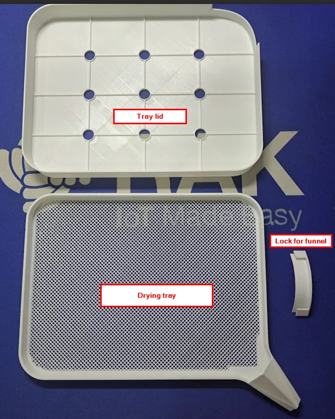 - Khay sấy kèm phễu (do cài đặt in đặc biệt nên gồm 2 phần kết hợp thành 1)