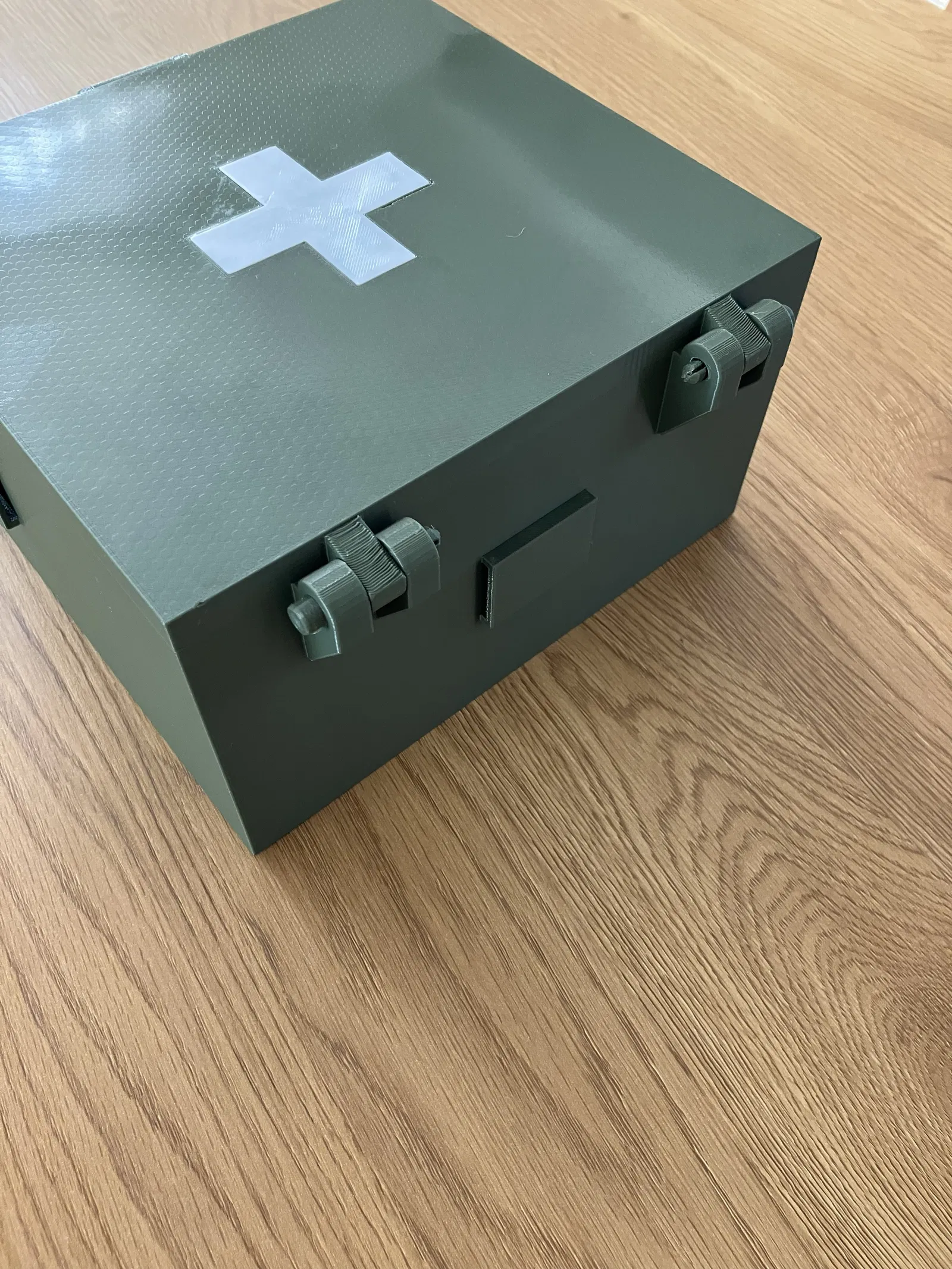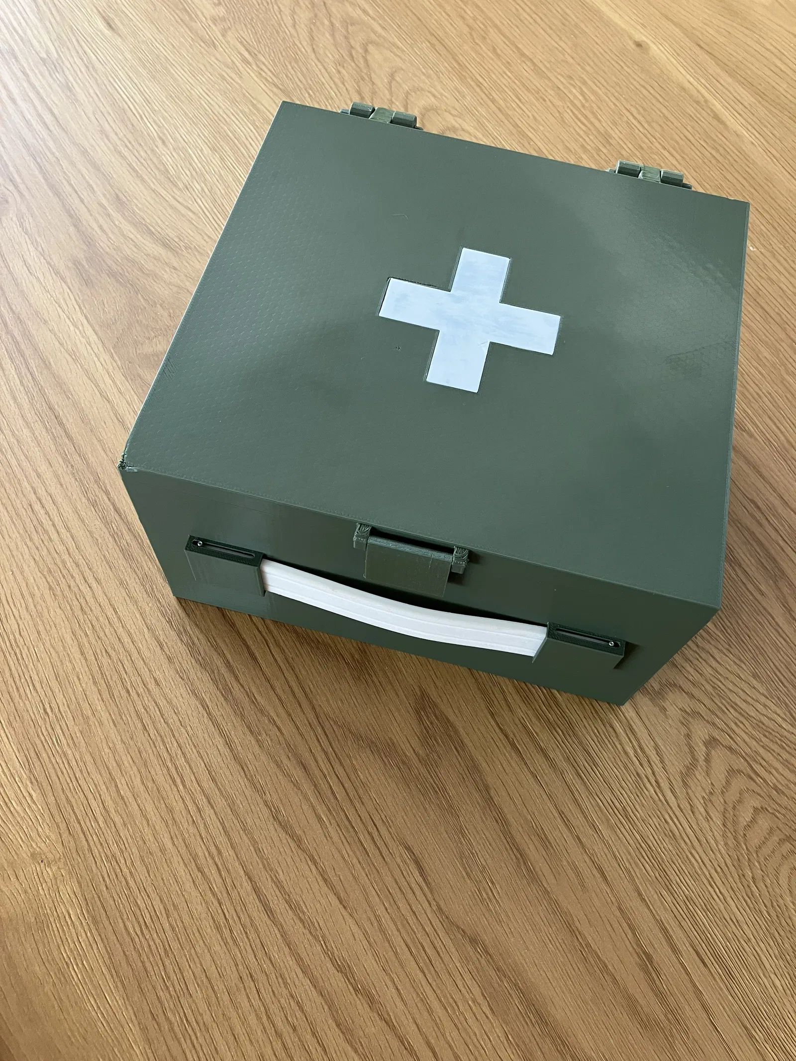 Hộp đựng sơ cứu (Medkit case) dùng để lưu trữ các vật dụng y tế. Mình đã in bằng chất liệu PETG. Mình dùng dây thép không gỉ đường kính 1 mm làm chốt cho cả ba vị trí. Có 3 giá đỡ ở hai bên, bạn có thể tùy chọn gắn dây đeo để mang qua vai (bản rộng 25 mm). Dấu thập cần được dán lên trên nắp hộp. Tay cầm được in bằng nhựa dẻo (mình dùng TPE 32).