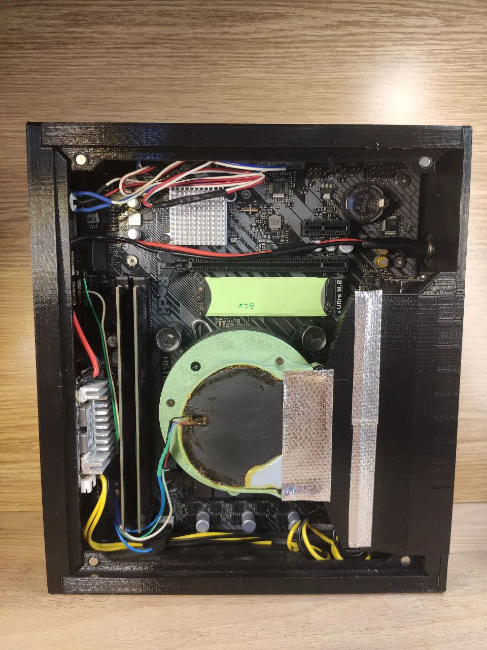 Mình đã tháo quạt zin trên tản nhiệt Intel thế hệ 12 và thay bằng một quạt lồng sóc (radial fan) từ laptop để hút khí xuyên qua tản nhiệt. Khí nóng sẽ được đẩy ra phía sau thông qua ống dẫn khí in 3D. Khí tươi lấy từ phía trước, làm mát cho Pico PSU và các linh kiện xung quanh CPU. Nhiệt lượng sinh ra được giới hạn bởi mức tiêu thụ điện năng thấp của CPU.