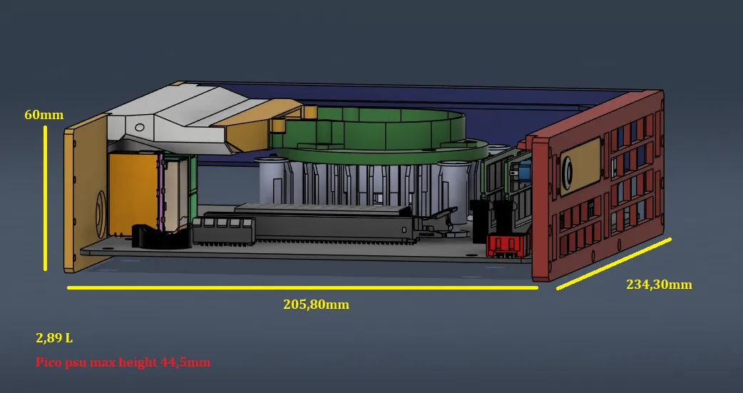 Đây là phiên bản nâng cấp từ bản thiết kế cũ của mình. Mình biết nó quá nhỏ để chứa ổ cứng HDD, card đồ họa rời, nguồn ATX hay lắp thêm quạt. Nó có nhiều hạn chế.