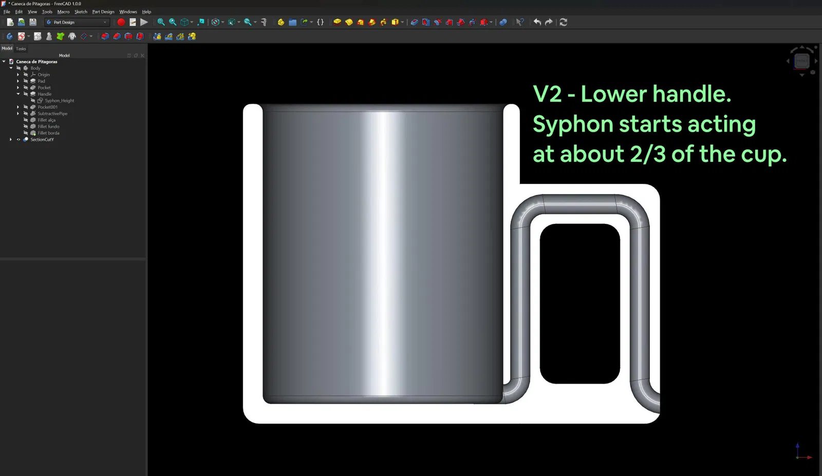 Chiếc cốc Pythagoras nổi tiếng có một ống siphon ở giữa, nó sẽ rút hết sạch nước nếu bạn đổ quá vạch quy định. Mình đã biến tấu nó thành một chiếc cốc cà phê với ống siphon được giấu khéo léo bên trong tay cầm. Phiên bản này được thiết kế bằng phần mềm FreeCAD phiên bản 0.20. Để tìm hiểu thêm về chiếc cốc Pythagoras, bạn có thể ghé thăm: https://en.wikipedia.org/wiki/Pythagorean_cup