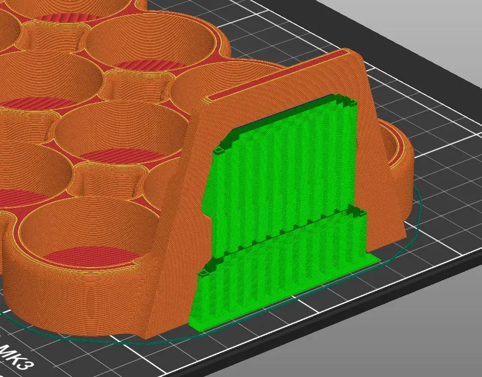 Tôi đã in chúng bằng PLA. Mặc dù chúng được thiết kế không cần hỗ trợ, tôi thấy rằng các phần nhô ra dễ bị cong ở các cạnh và bị va chạm bởi đầu phun, và hoàn thiện ở những khu vực đó có phần hơi thô. Tôi khuyên bạn nên sử dụng hỗ trợ, loại lưới, được định hướng như trong hình để có độ che phủ tốt nhất.
