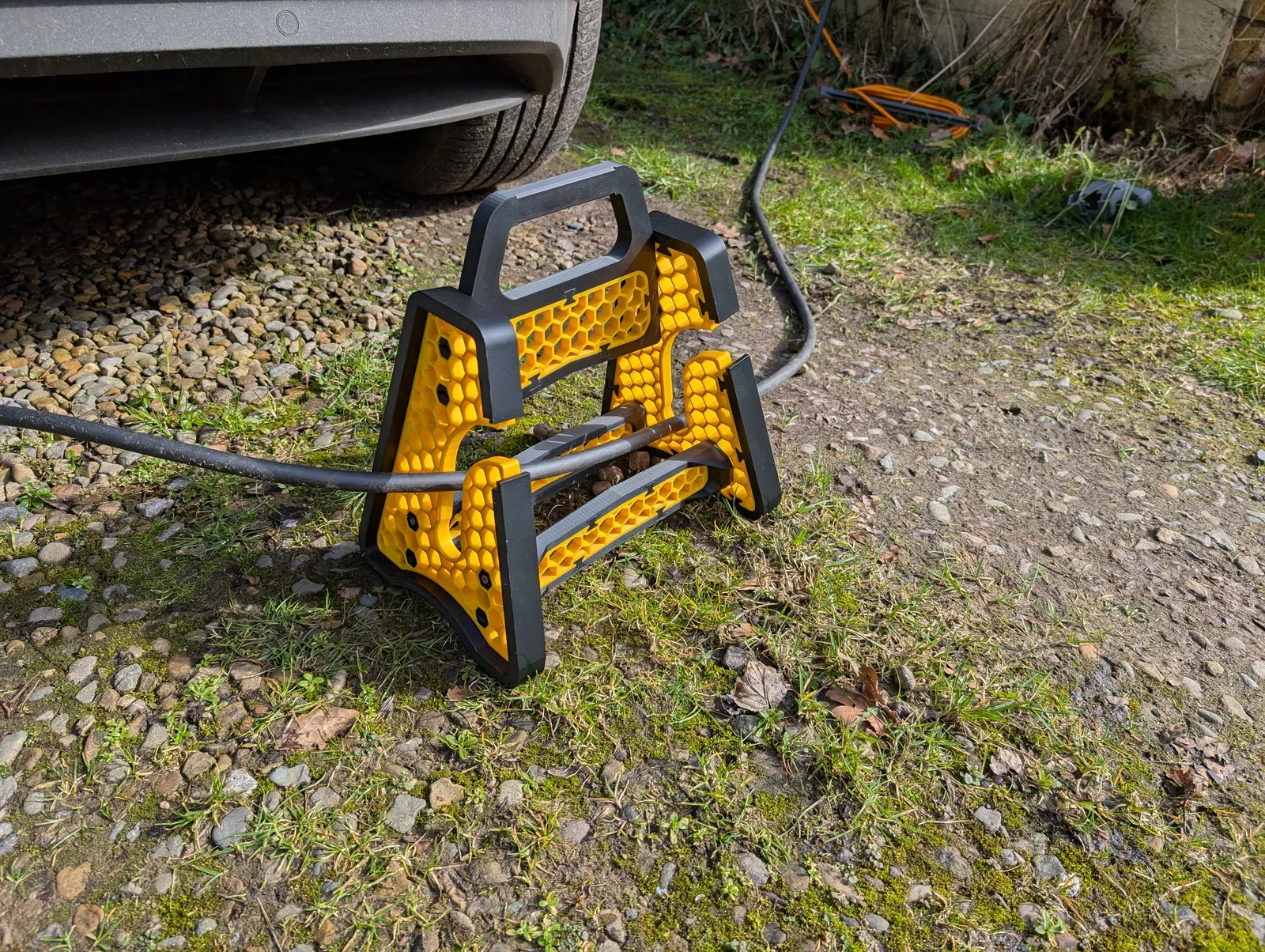 Thiết bị này bao gồm tay cầm và giá đỡ giúp bạn luồn cáp EV qua, đồng thời có phần tay nắm ở phía trên, tránh xa bùn đất. Tay cầm cũng được thiết kế đủ lớn để bạn có thể treo lên móc gắn tường, giúp cất giữ cáp cố định tại chỗ.