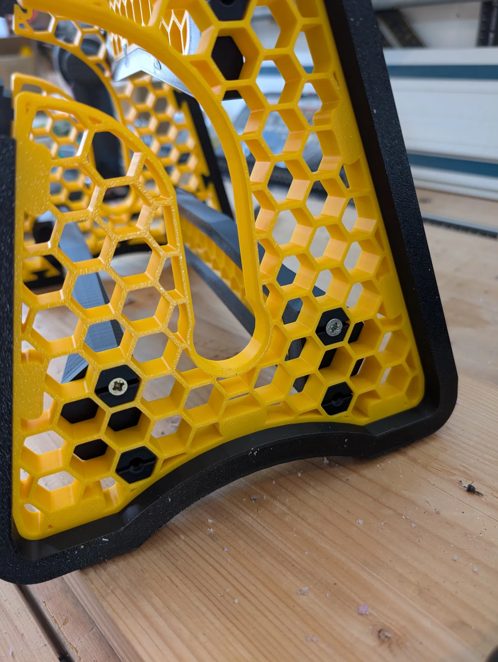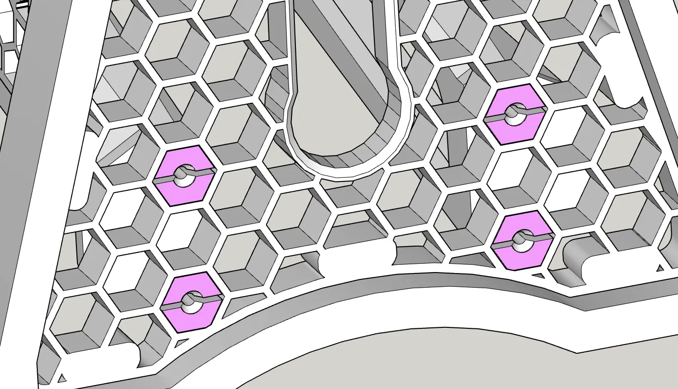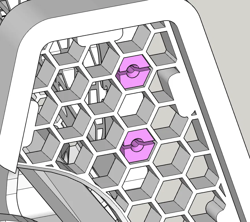 In ấn: Cần dùng support (hỗ trợ) ở các chốt khe cắm trên đầu tay cầm và các thanh giằng. Phần bên trái và tấm lưới bên trái được tạo ra bằng cách lật ngược các bộ phận bên phải trong phần mềm slicer.