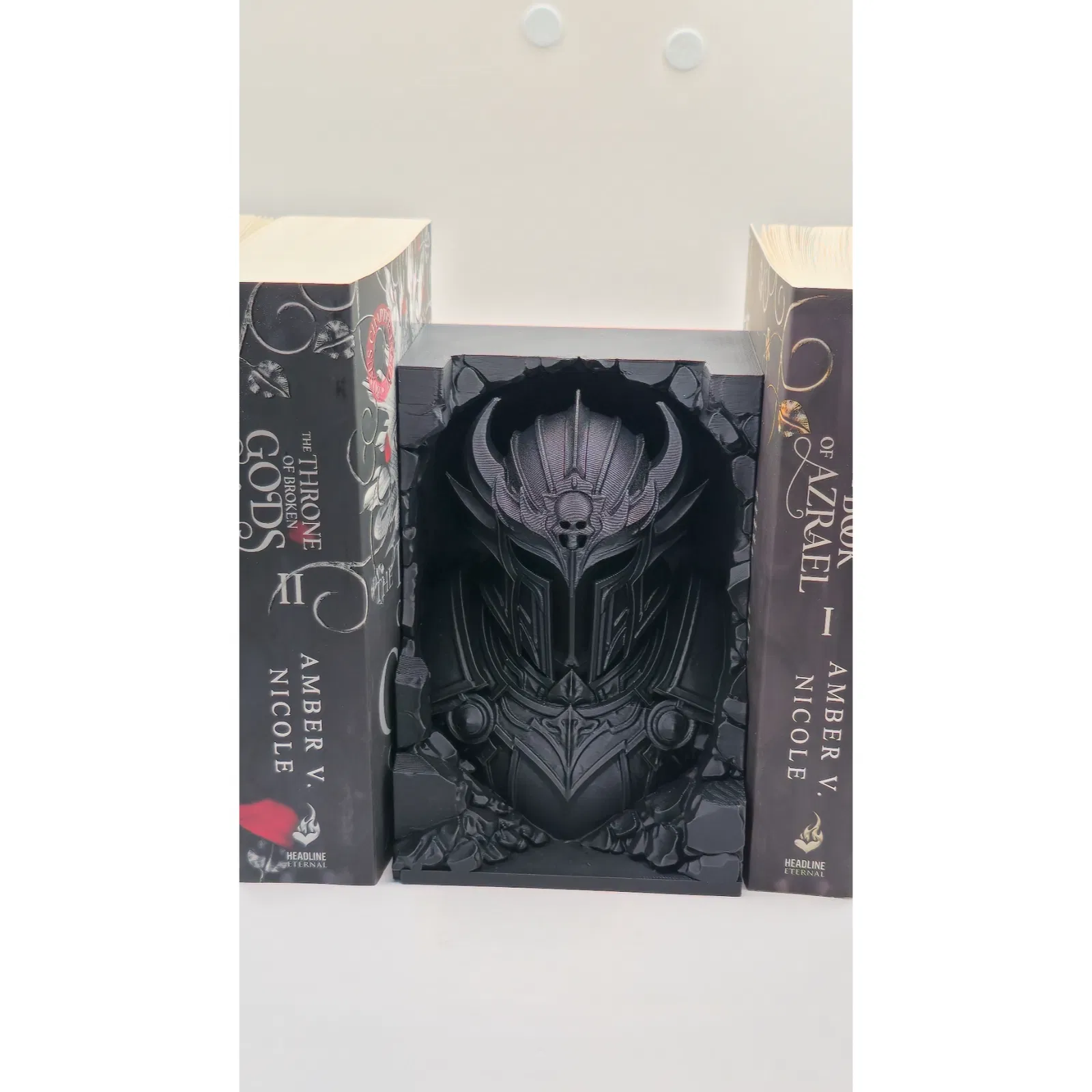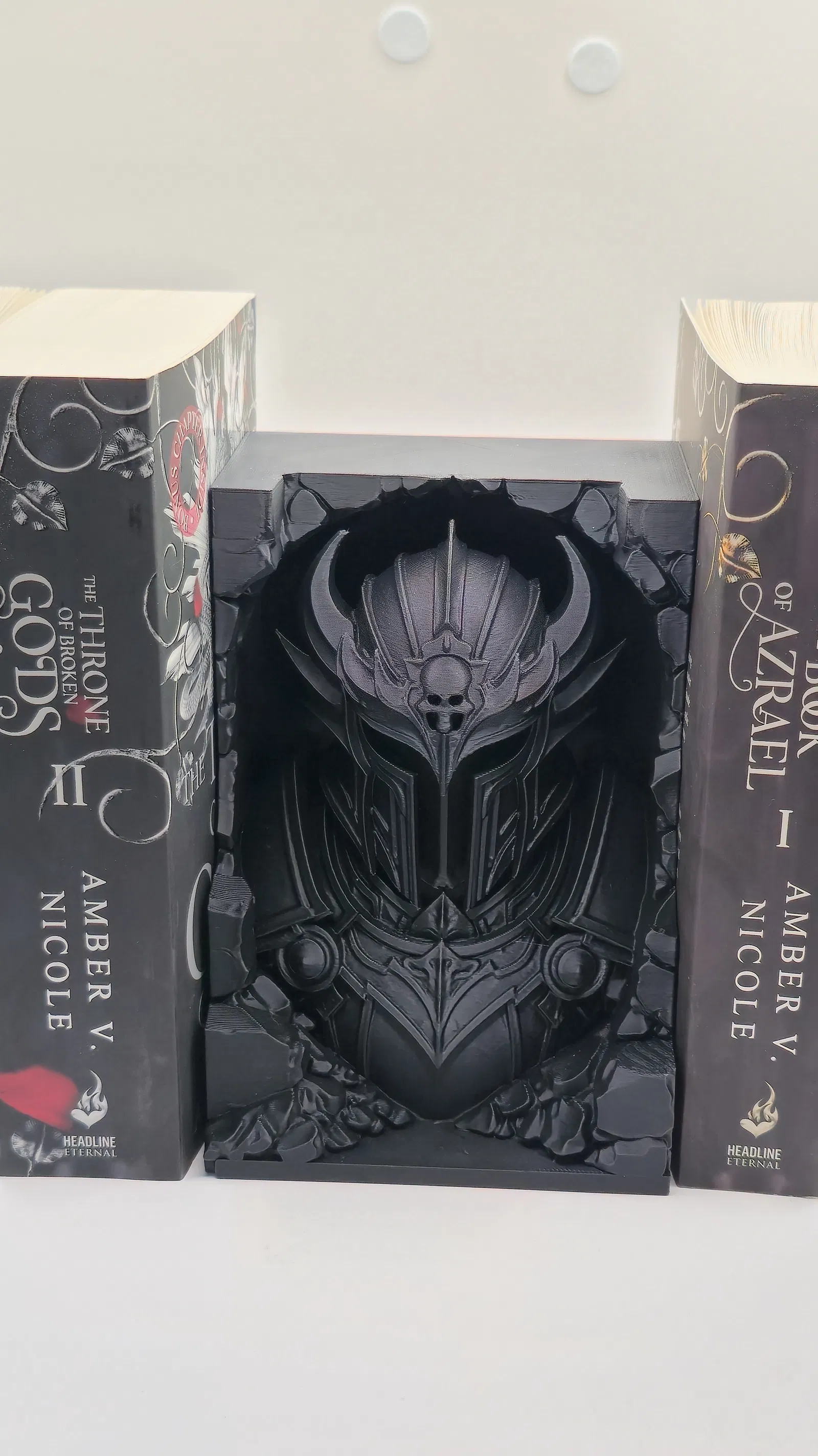 Biến kệ sách của bạn thành cánh cổng dẫn vào một thế giới dark fantasy đầy mê hoặc với mẫu Dark Knight Helmet Book Nook cực chất này. Được thiết kế để đặt hoàn hảo giữa các cuốn sách, món đồ trang trí này hé lộ hình ảnh một chiếc mũ giáp của chiến binh đang nhô ra từ bức tường đá nứt vỡ, tựa như một vị hiệp sĩ cổ đại đang ẩn mình ngay trong thư viện của bạn.