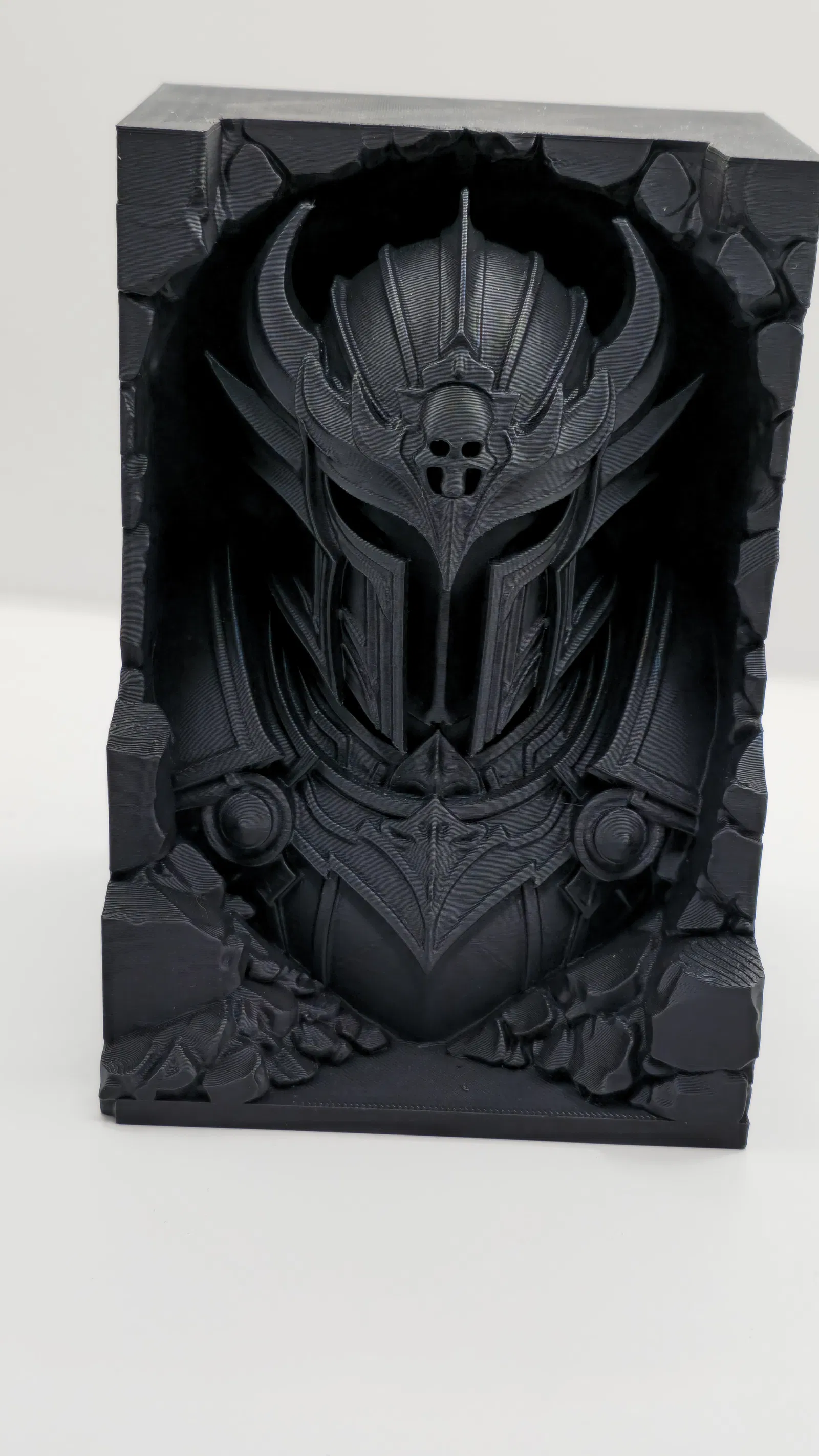 Biến kệ sách của bạn thành thế giới dark fantasy với Book Nook Mũ Hiệp Sĩ Bóng Đêm. Thiết kế ấn tượng với hình ảnh mũ giáp chiến binh nhô ra từ tường đá, tạo điểm nhấn đầy bí ẩn và cuốn hút cho góc đọc sách của bạn. Tối ưu để in 3D dễ dàng.