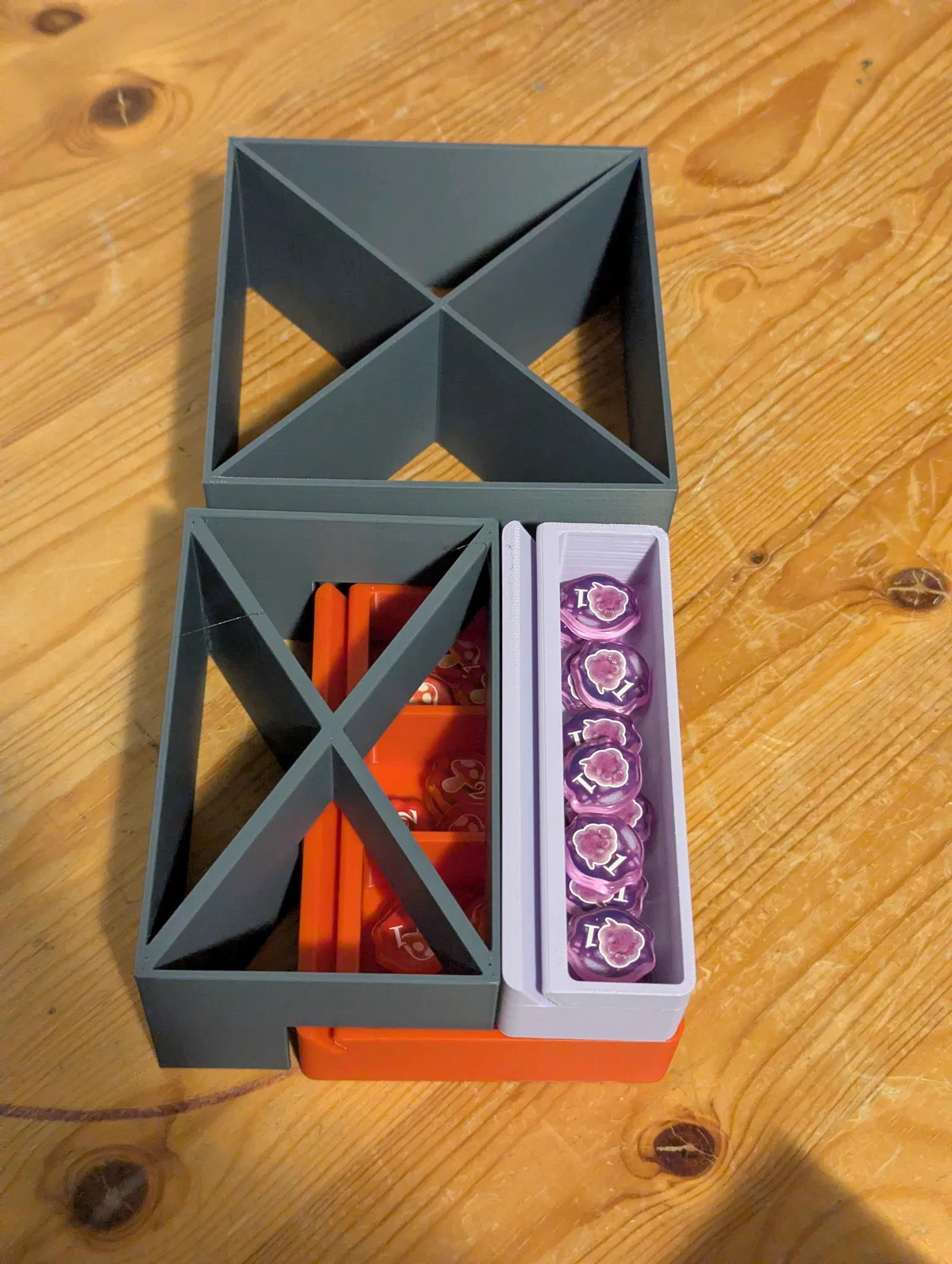 Mình đã sửa đổi một trong các khay chặn (blocker_modified.stl) trong bộ này để có thể chứa thêm một bits-box-4x từ bộ file gốc (bạn sẽ cần tổng cộng 5 hộp loại này) và file pink_token_box.stl của mình.