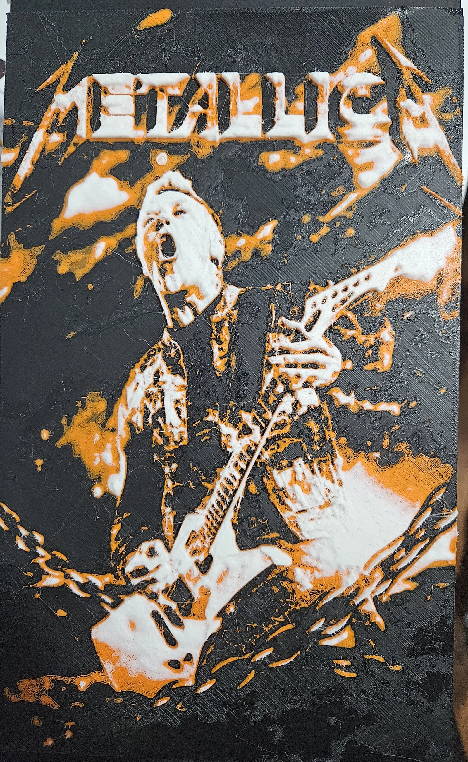 Tranh treo tường nghệ thuật Metallica theo phong cách Hueforge cực chất. Dễ dàng thực hiện in ấn với các bước đổi nhựa thủ công theo từng lớp, mang lại sản phẩm trang trí ấn tượng cho người hâm mộ nhạc rock.
