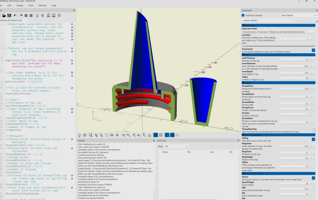 Trình tạo nắp chai tham số tiện lợi, cho phép bạn tự thiết kế vòi rót, lỗ thoát khí và vòng đệm tùy chỉnh. Hỗ trợ thay đổi thông số dễ dàng qua OpenSCAD để phù hợp với mọi nhu cầu sử dụng của bạn.