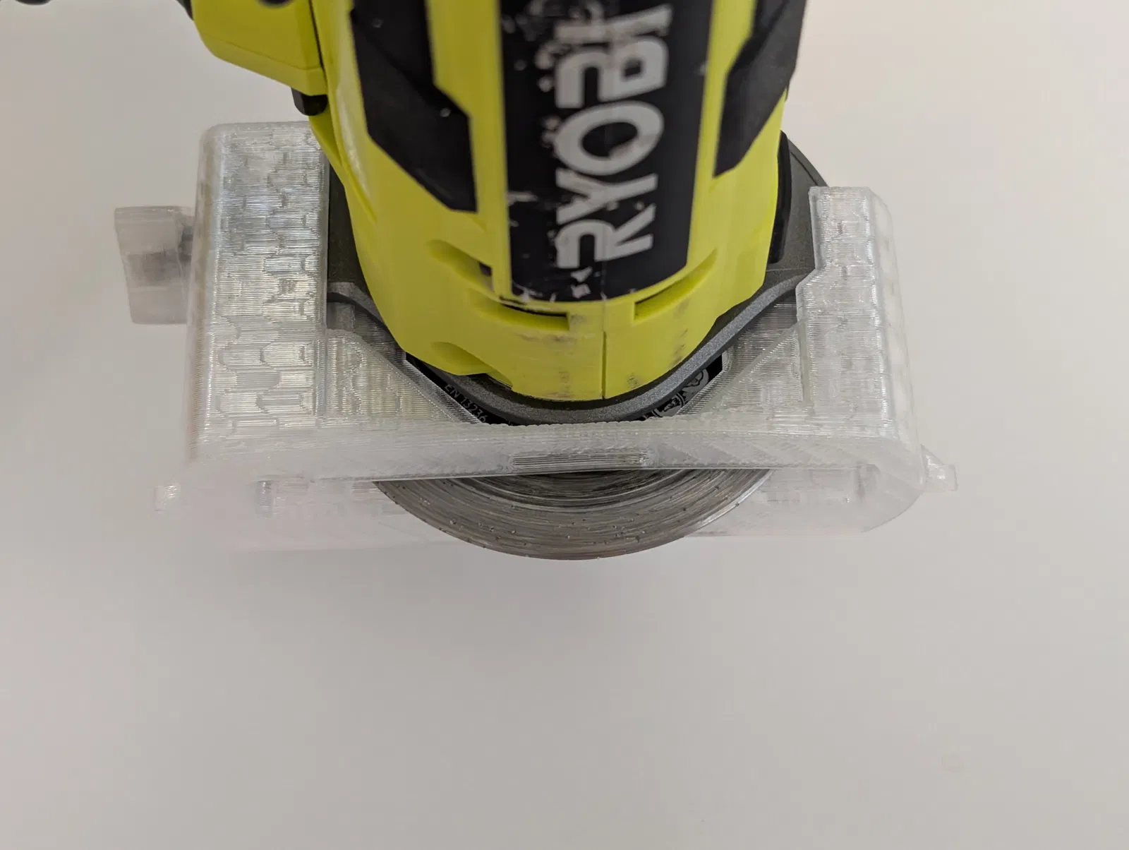 Bản thử nghiệm nắp chắn bụi cho máy cắt mini Ryobi, hỗ trợ kết nối máy hút bụi và cho phép điều chỉnh độ sâu cắt linh hoạt trong khoảng 12 mm. Lưu ý đây là phiên bản prototype cần tự tùy chỉnh khi lắp đặt.