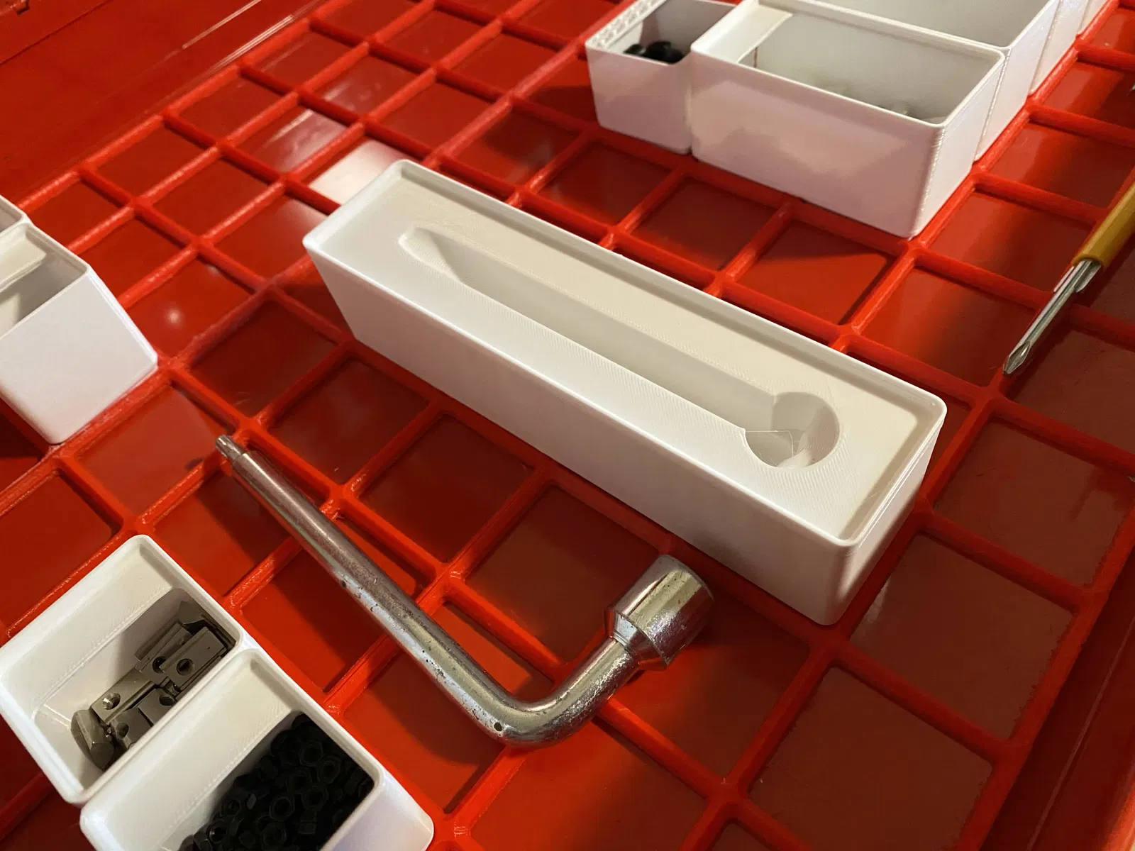 Đây là khay đựng cờ lê được thiết kế riêng biệt theo hệ thống Gridfinity cực kỳ phổ biến. Với cấu trúc vừa khít với dòng cờ lê mã 608563-01, khay này giúp bác cố định dụng cụ ngay trên tấm nền Gridfinity. Thiết kế khay được khoét rỗng theo đúng hình dạng của cờ lê, đảm bảo dụng cụ nằm ngay ngắn, vững chãi, tránh tình trạng va đập làm hư hỏng hoặc trầy xước không đáng có trong quá trình làm việc.