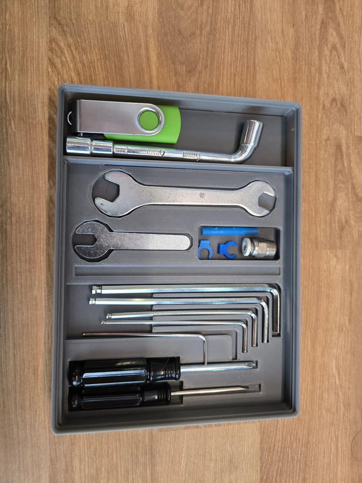 Sử dụng chuẩn Gridfinity giúp khay có độ ổn định cực cao khi đặt trên các tấm đế cùng hệ sinh thái. Thiết kế được tối ưu hóa theo đúng kích thước bộ dụng cụ tiêu chuẩn của dòng máy Neptune 4, bao gồm các ngăn chuyên dụng cho bộ lục giác, cờ lê đầu hở và các tua vít đi kèm. Anh em chỉ cần in ra, đặt vào tấm base Gridfinity là xong, cảm giác khi thấy các dụng cụ nằm đúng vị trí của nó thực sự rất thỏa mãn, giúp quy trình bảo trì máy in sau này nhanh chóng và tiện lợi hơn nhiều.