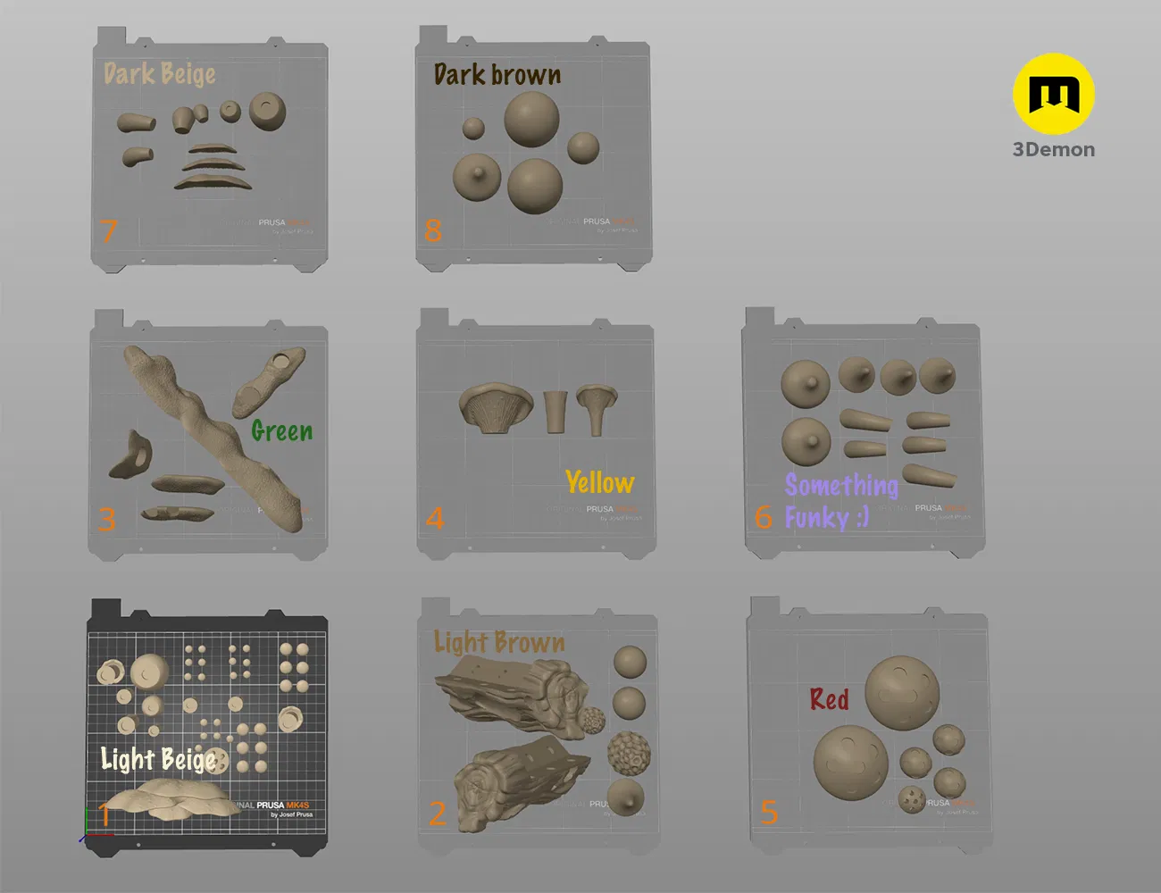 - File STL (từng cây nấm, nút bấm, khúc gỗ và cụm rêu riêng lẻ)
