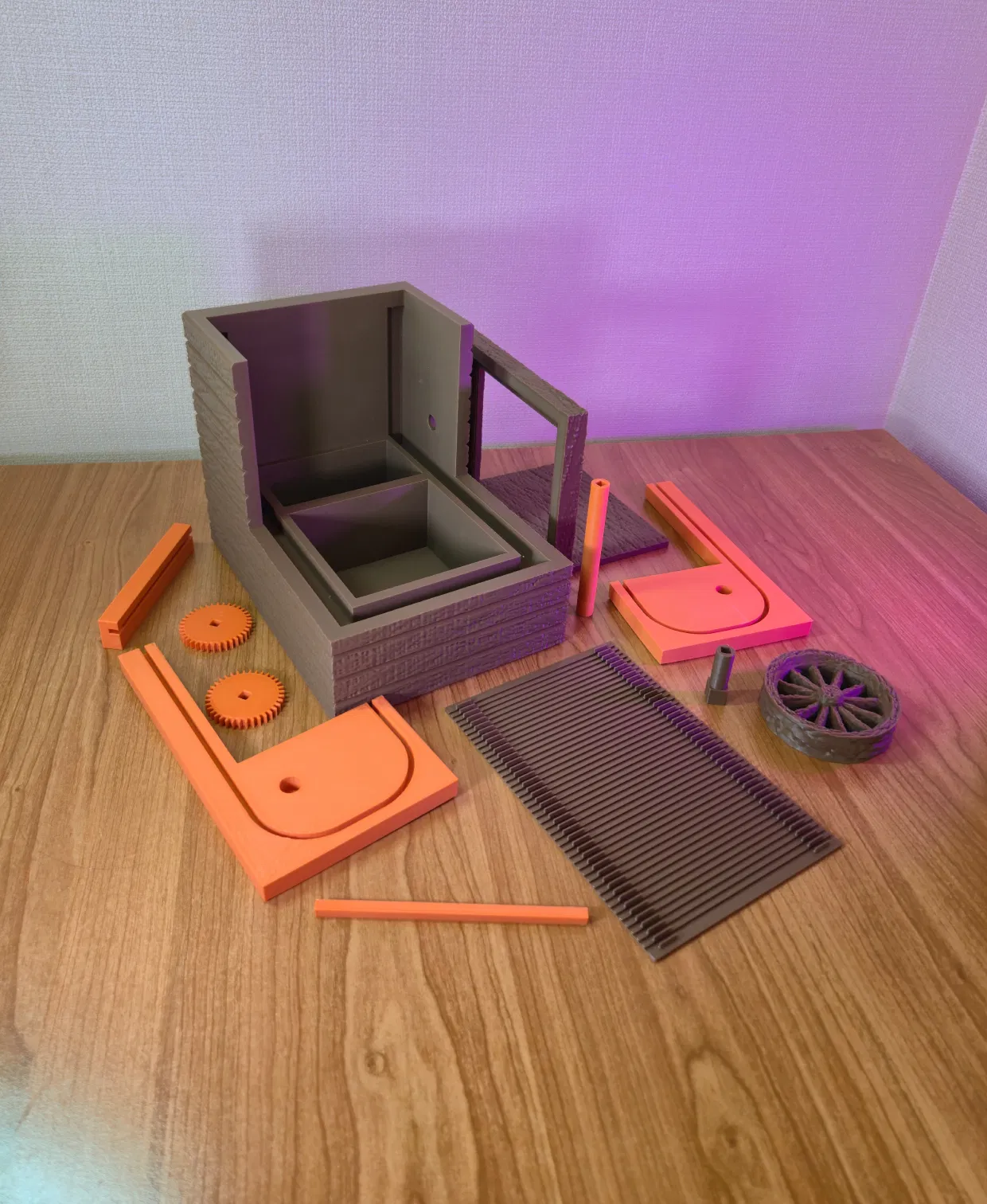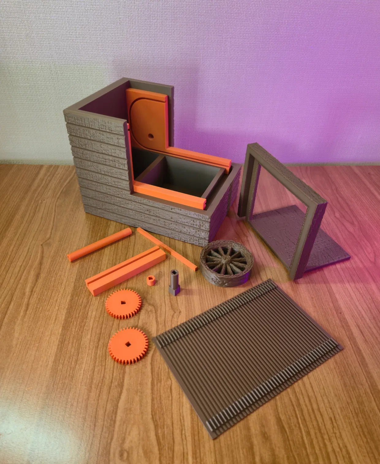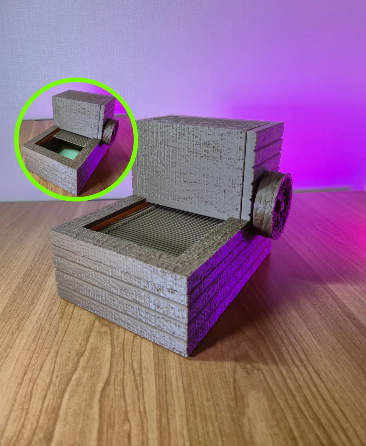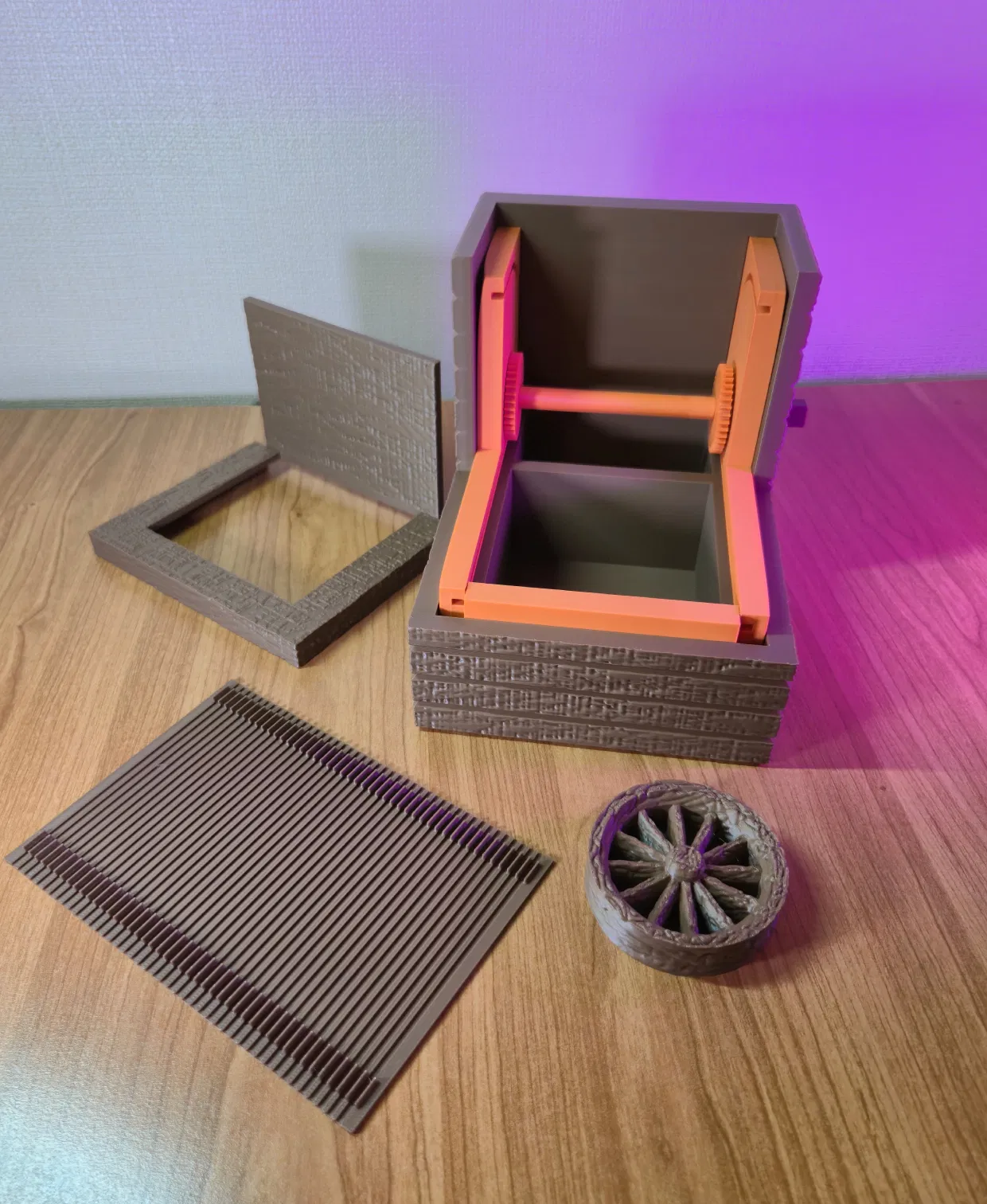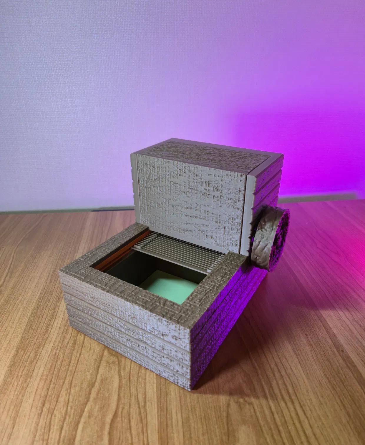 Thiết kế này tập trung vào việc tạo ra cảm giác như một cơ chế thu nhỏ thời trung cổ. Cấu trúc vân gỗ và bánh xe lớn bên hông gợi nhớ đến các thiết bị máy móc xưa cũ, còn nắp bẫy trượt lại mang đến cảm giác khám phá đầy bất ngờ. Việc mở hộp trở thành một phần của trải nghiệm, rất thích hợp để cất giữ các món đồ nhỏ, mảnh giấy ghi chú hoặc những vật giá trị một cách đầy tinh nghịch và bí ẩn.
