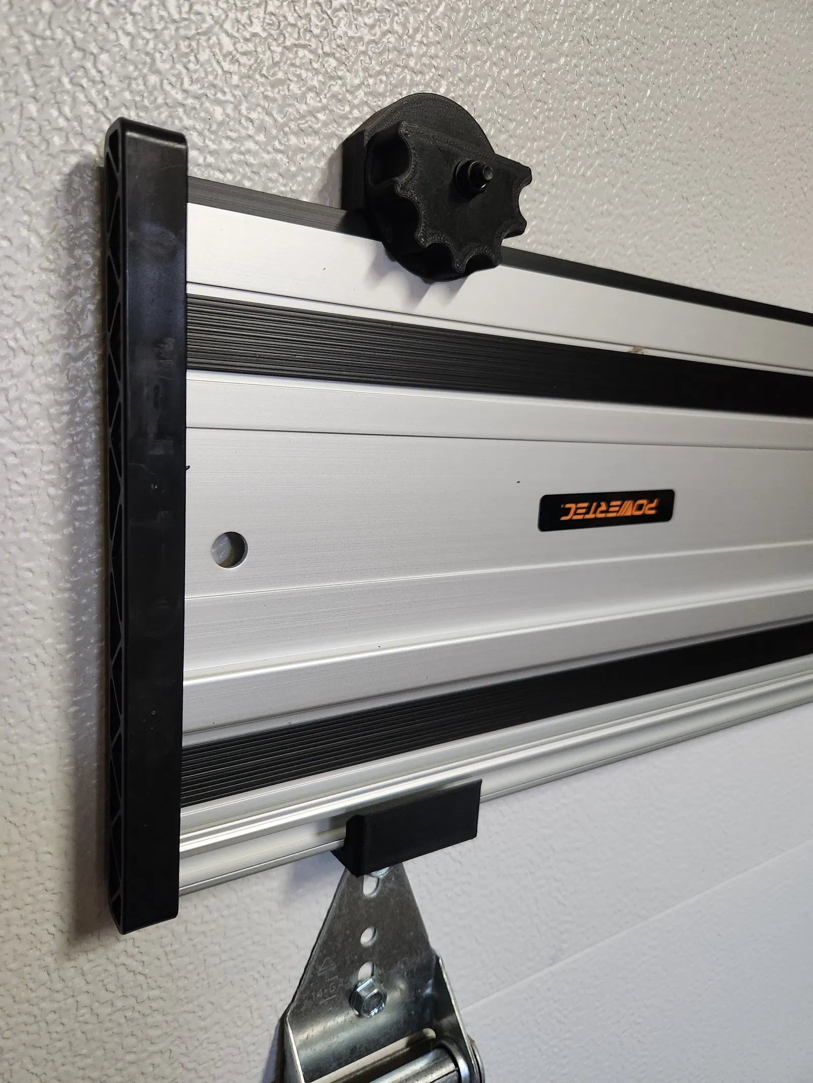 Đúng như phần mô tả đã nêu, thanh ray Powertec có kích thước rộng hơn đáng kể (19cm) do có thêm phần linh hoạt gần lưỡi cắt. Giá đỡ này được thiết kế với kích thước 191mm, lắp vào vừa khít như in.