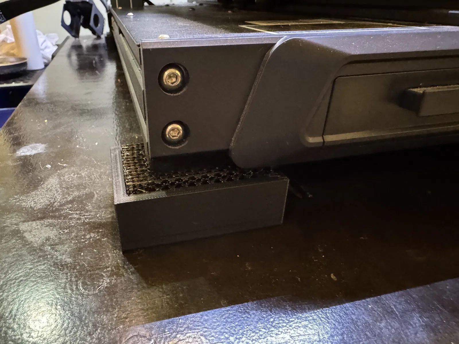 Tôi đã thử qua nhiều loại chân chống rung khác, nhưng vấn đề là với dòng máy bed slinger khổ lớn này, máy in vẫn cứ bị trượt dần dần trên bàn. Có lần suýt nữa là máy rớt khỏi bàn luôn, nên tôi đã tự thiết kế bộ này để bắt vít cố định trực tiếp xuống mặt bàn.