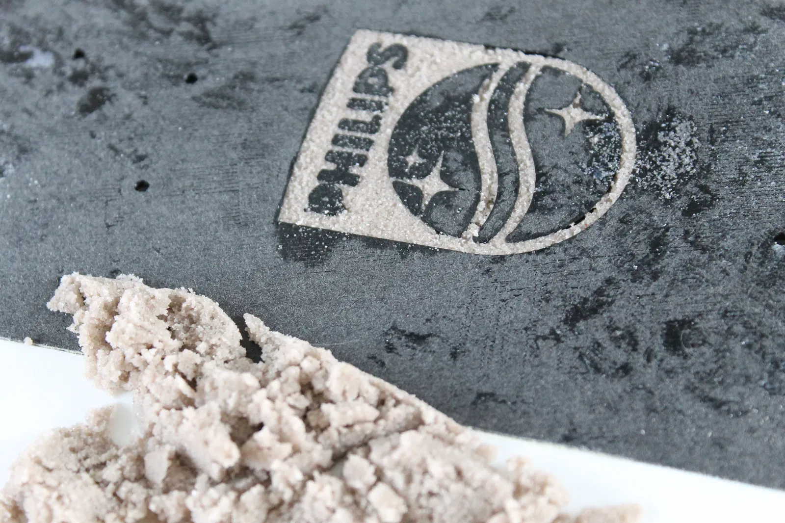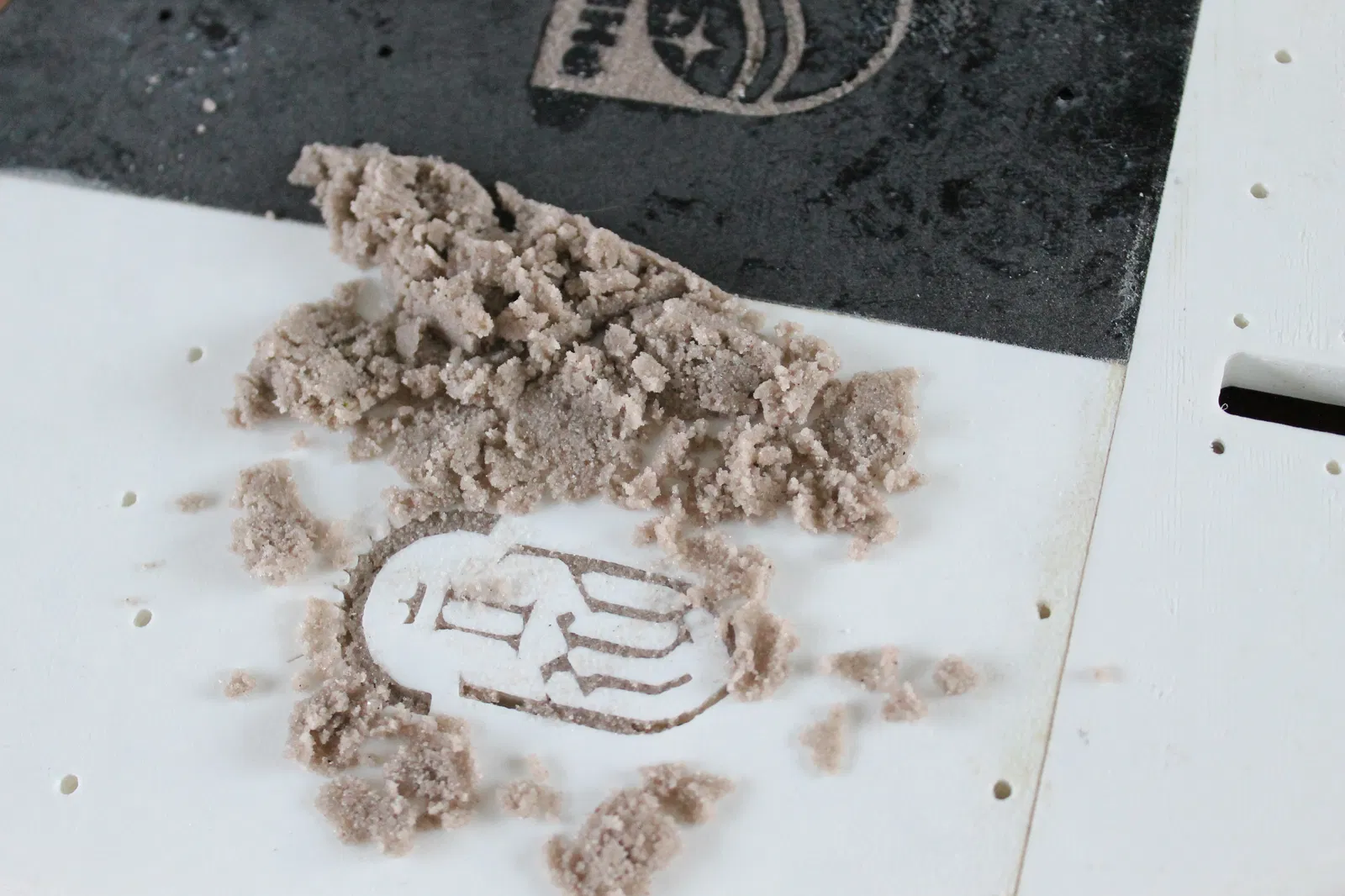 Chà nhám toàn bộ bề mặt. Không nên chà quá tay. Bảo vệ phần logo bằng cách lấp đầy cát thạch anh để giữ độ xuyên sáng khi phun sơn.