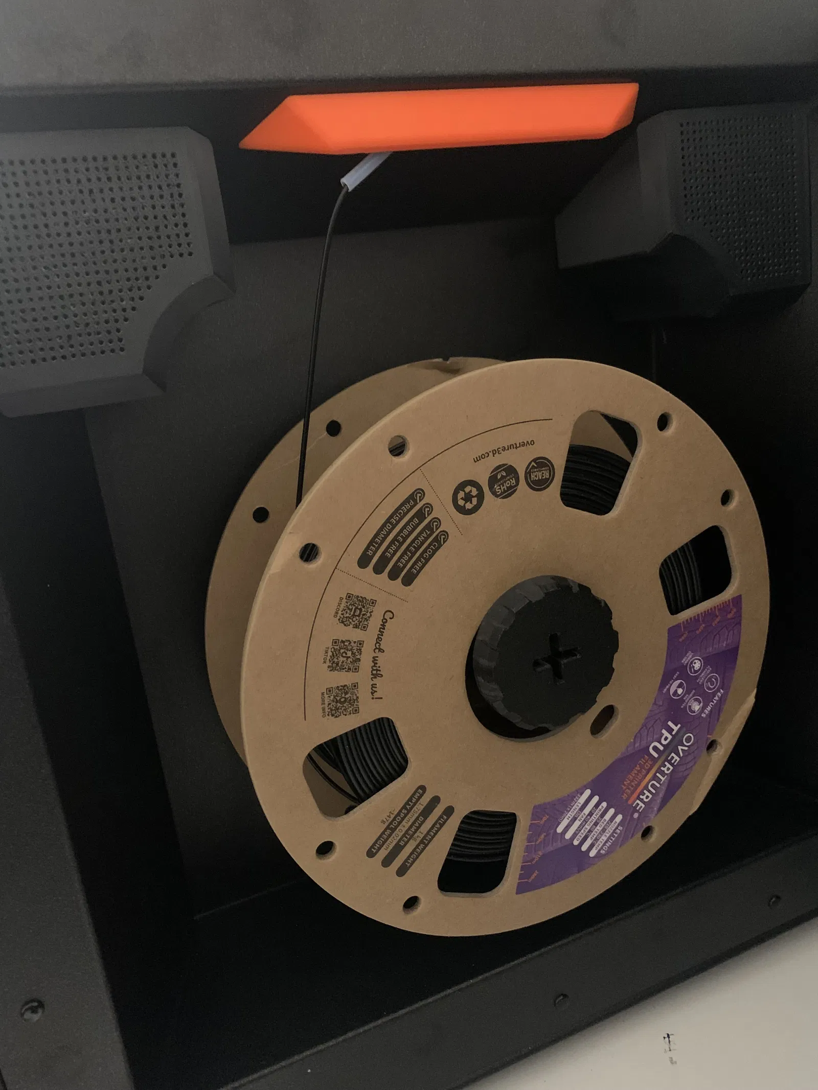 Hộp đựng hạt hút ẩm được thiết kế giúp in dễ dàng hơn, vừa vặn để đặt ở cả bốn góc của Core One. Thiết kế này không cần support, phù hợp với nhiều loại nhựa, riêng nắp nên in bằng TPU.