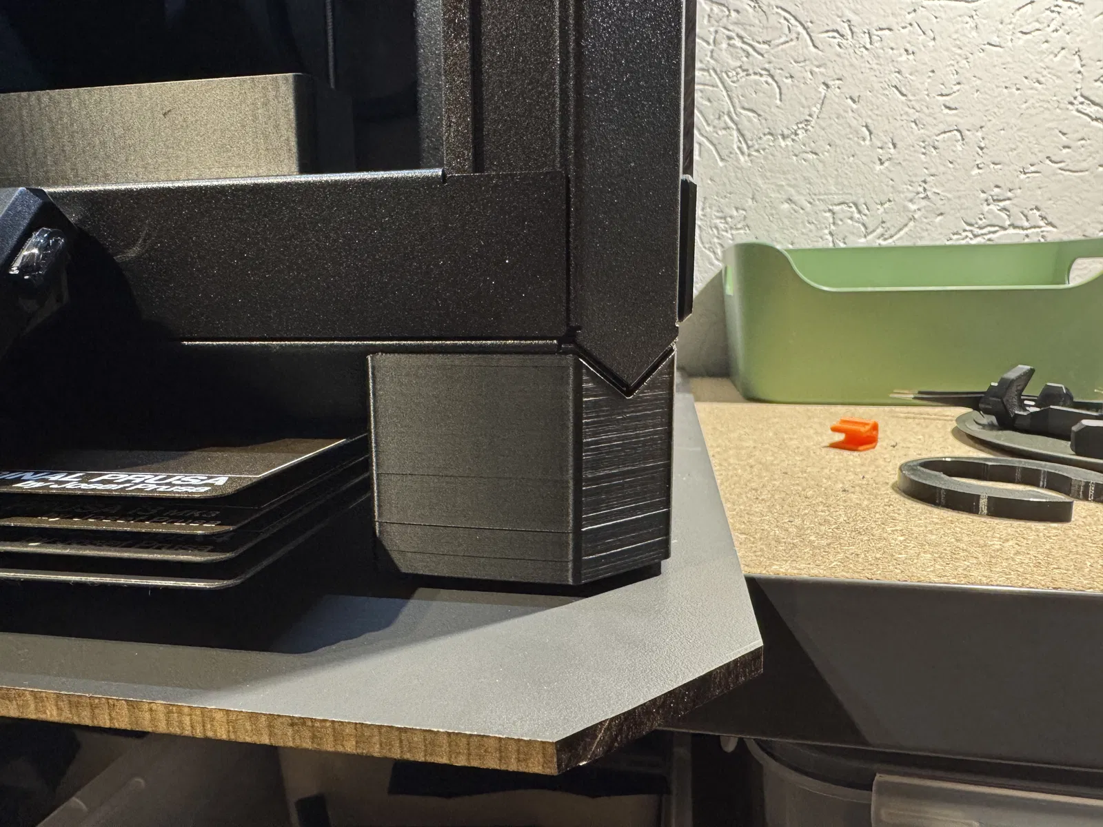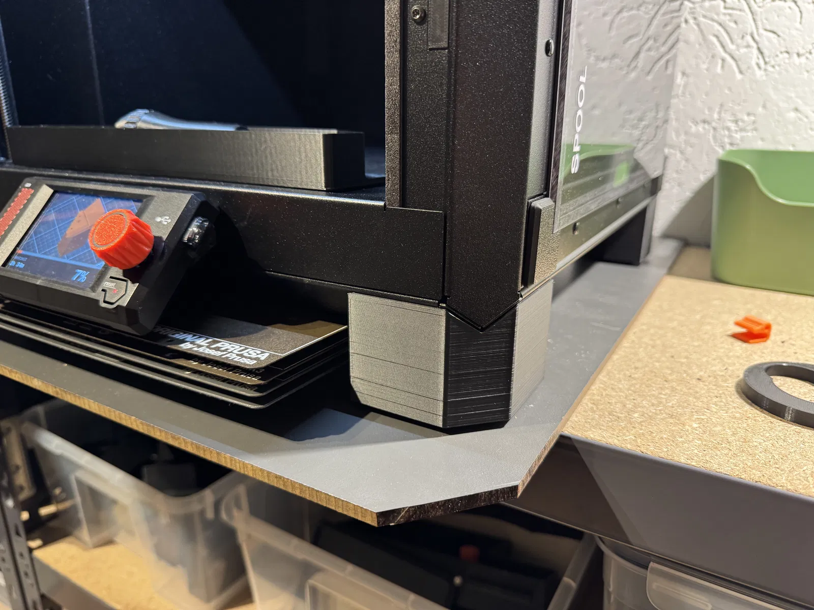 Điểm đặc biệt của thiết kế này là khả năng tận dụng lại các miếng đệm cao su gốc đi kèm theo máy, giúp đảm bảo sự ổn định và giảm thiểu rung chấn trong quá trình in ấn. Với độ cao được tăng thêm đáng kể, bạn có thể dễ dàng lắp đặt thêm các phụ kiện lưu trữ khác, chẳng hạn như khay đựng tấm in (print sheet holder), giúp tối ưu hóa diện tích bàn làm việc vốn thường rất hạn chế. Đây là một nâng cấp nhỏ nhưng mang lại sự thay đổi lớn trong cách quản lý không gian và thiết bị.