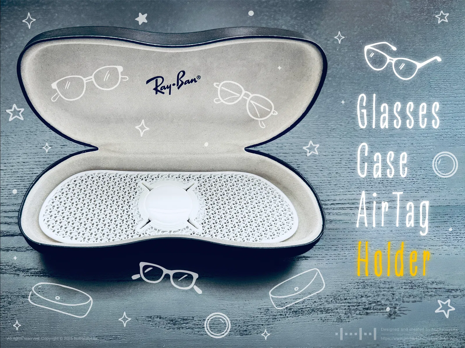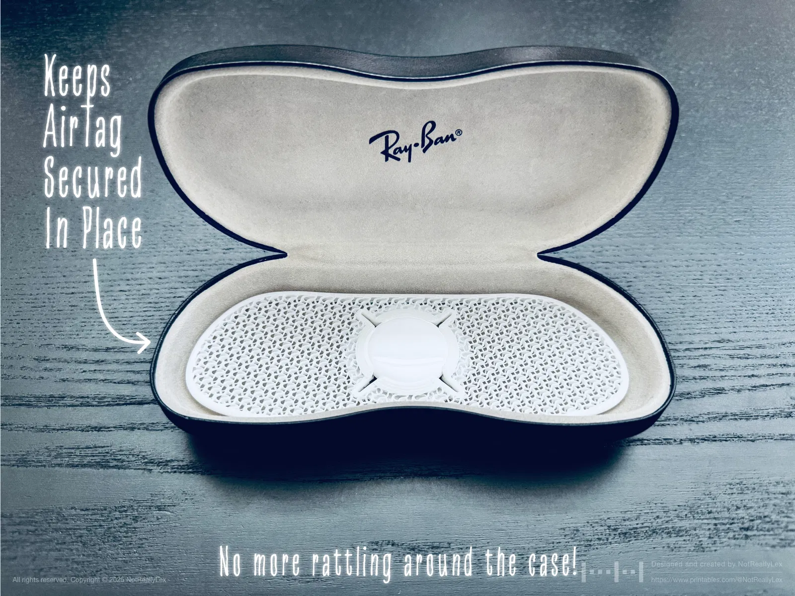 Một chiếc ốp giữ AirTag mỏng, có thể tạo hình bằng nhiệt, được thiết kế để lắp vừa vặn bên trong hộp kính Ray-Ban cứng. Phụ kiện này giúp cố định AirTag gọn gàng, tránh làm hộp bị xóc, và bảo vệ mắt kính của bạn khỏi các vết trầy xước không đáng có.