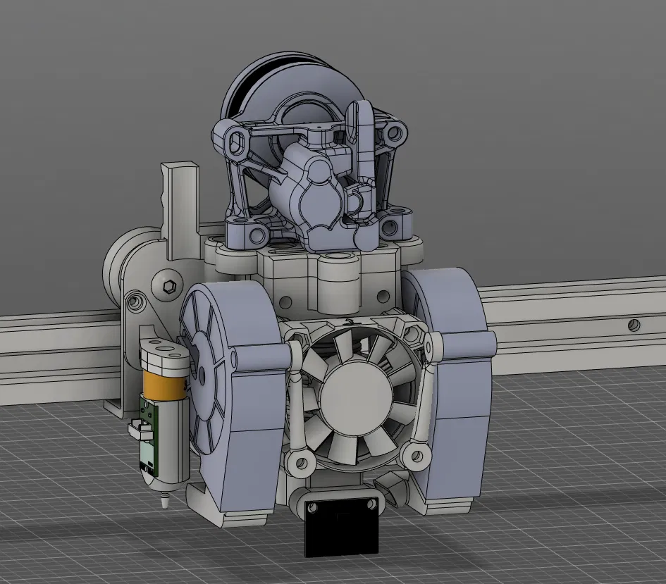 Bộ toolhead tùy chỉnh cho Ender 3 v2, hỗ trợ các loại máy đùn Sherpa mini/micro, quạt 5015 kép, hotend Volcano và vị trí gắn cảm biến ADXL345 tiện lợi. Lưu ý in bằng ABS và xem kỹ file thiết kế f3d để lắp đặt chính xác.