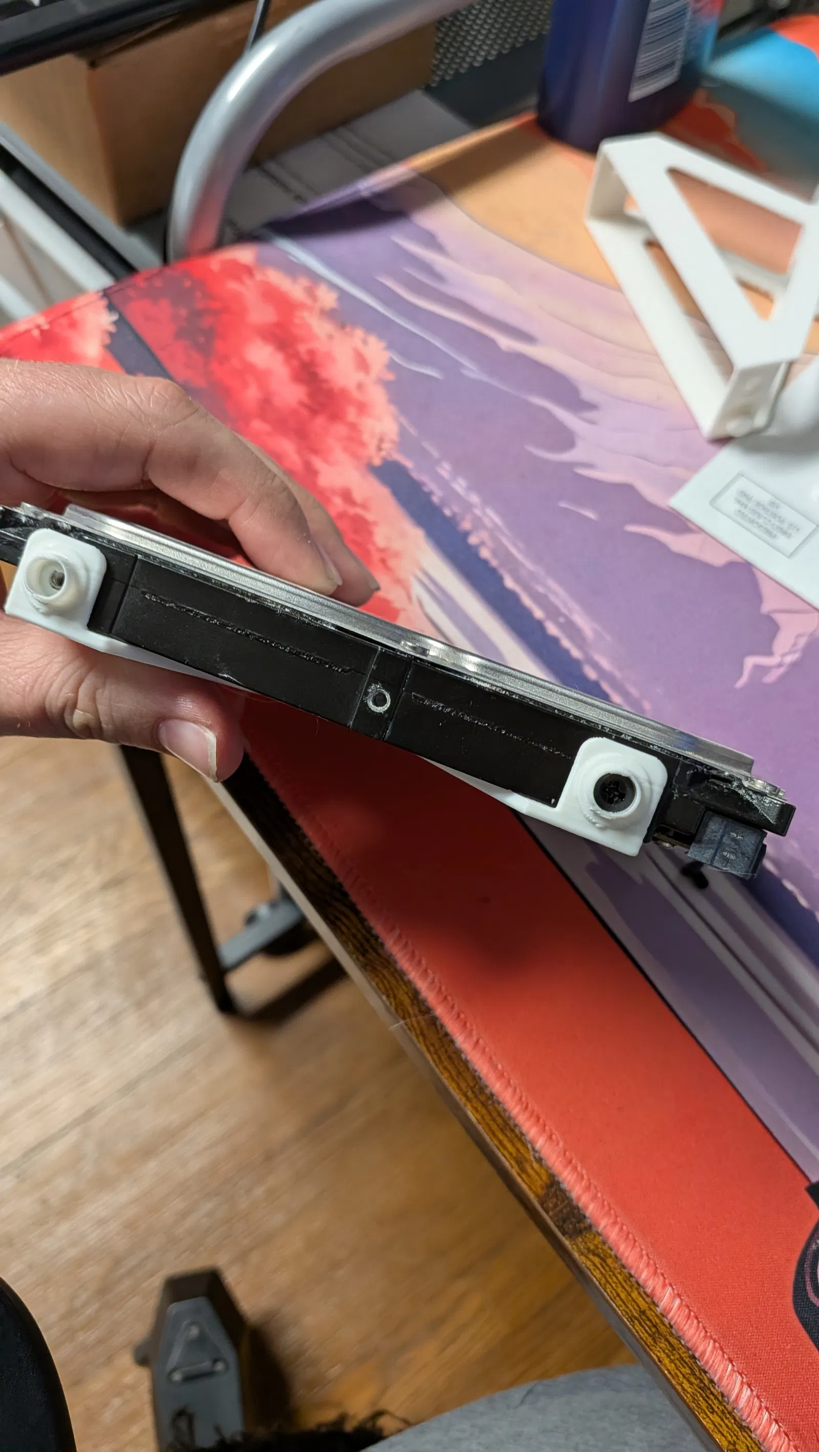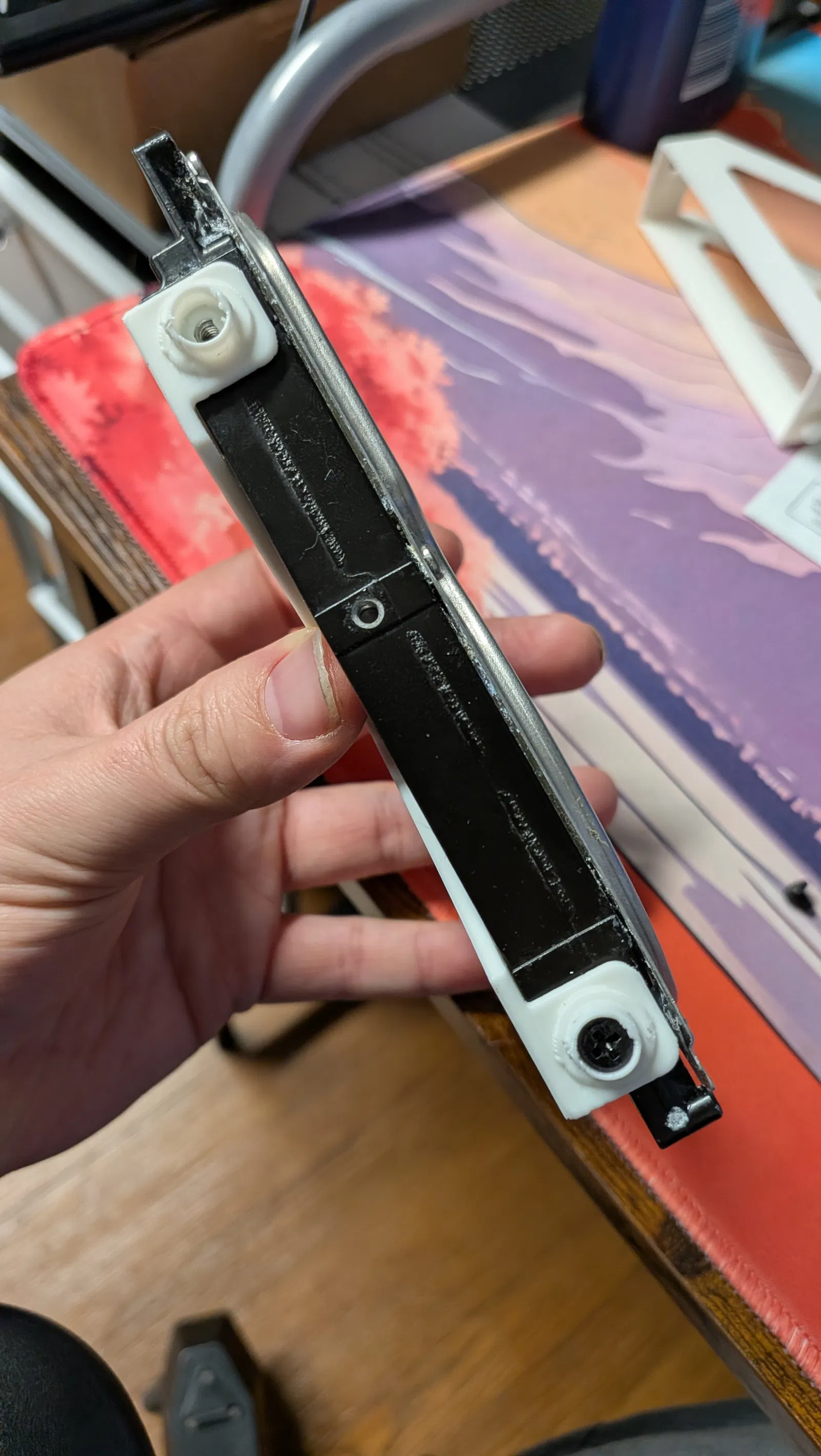 Mình đã thử dùng bản thiết kế gốc (của Scubadiver48) để gắn ổ cứng theo chiều ngang vào máy tính. Tuy nhiên, sau nhiều lần bị gãy chốt cài khi cố lắp ổ cứng vào, mình đã quyết định remix lại nó. Bản thiết kế này vẫn giữ nguyên khung cơ bản, nhưng mình đã khoét lỗ ở 4 chốt cài để tạo chỗ bắt ốc vít. Nhờ vậy, bạn có thể cố định ổ cứng vào khay chắc chắn mà vẫn lắp vừa vào khe ổ đĩa mà không gặp phiền toái gì. Bạn chỉ cần dùng ốc bắt HDD thông thường là ổ cứng sẽ nằm gọn gàng bên trong khay.