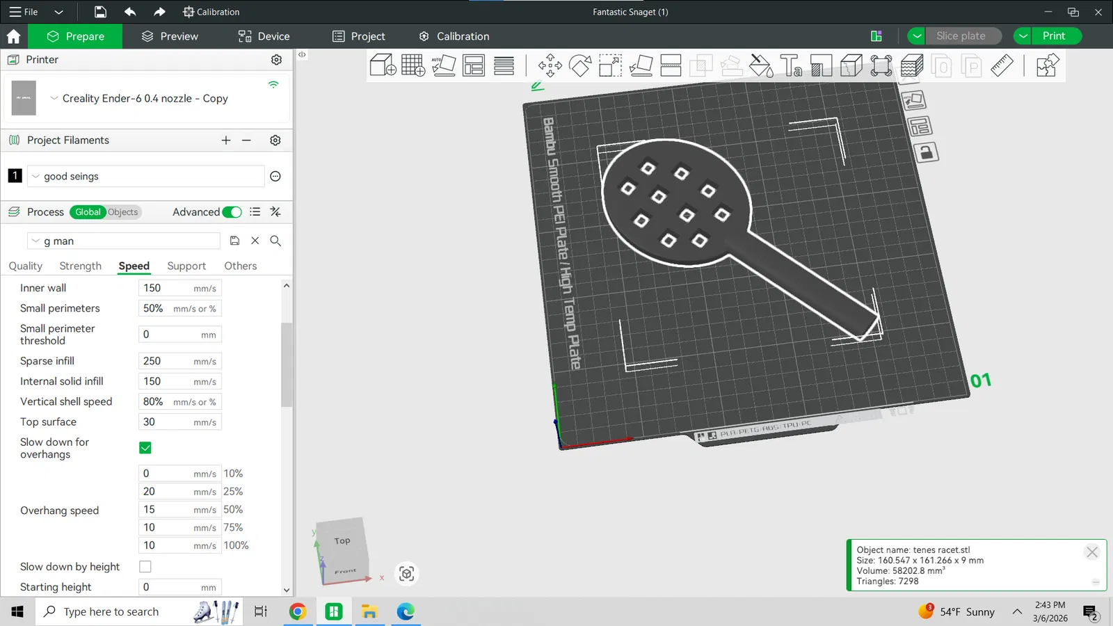 - Infill: Chỉ cần khoảng 15-20% infill là đủ để đảm bảo độ cứng cho mặt vợt mà không làm lãng phí nhựa.