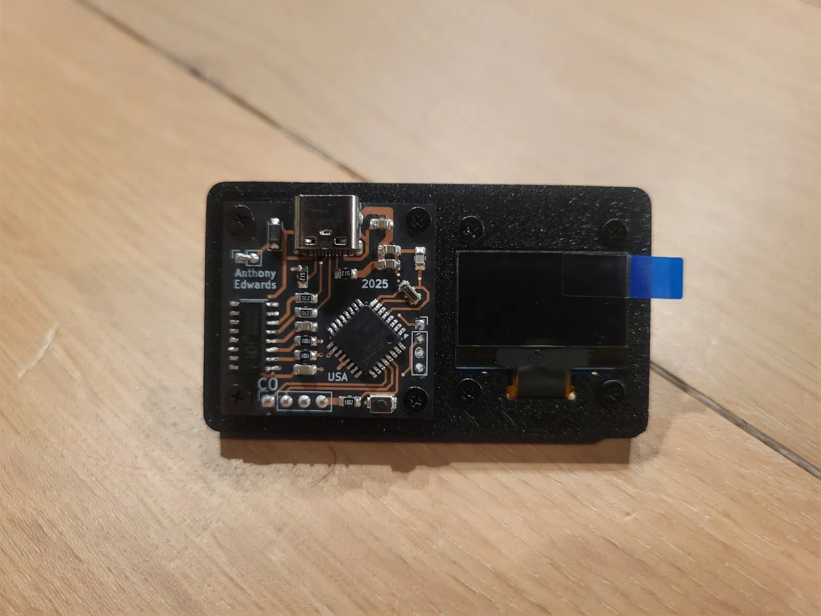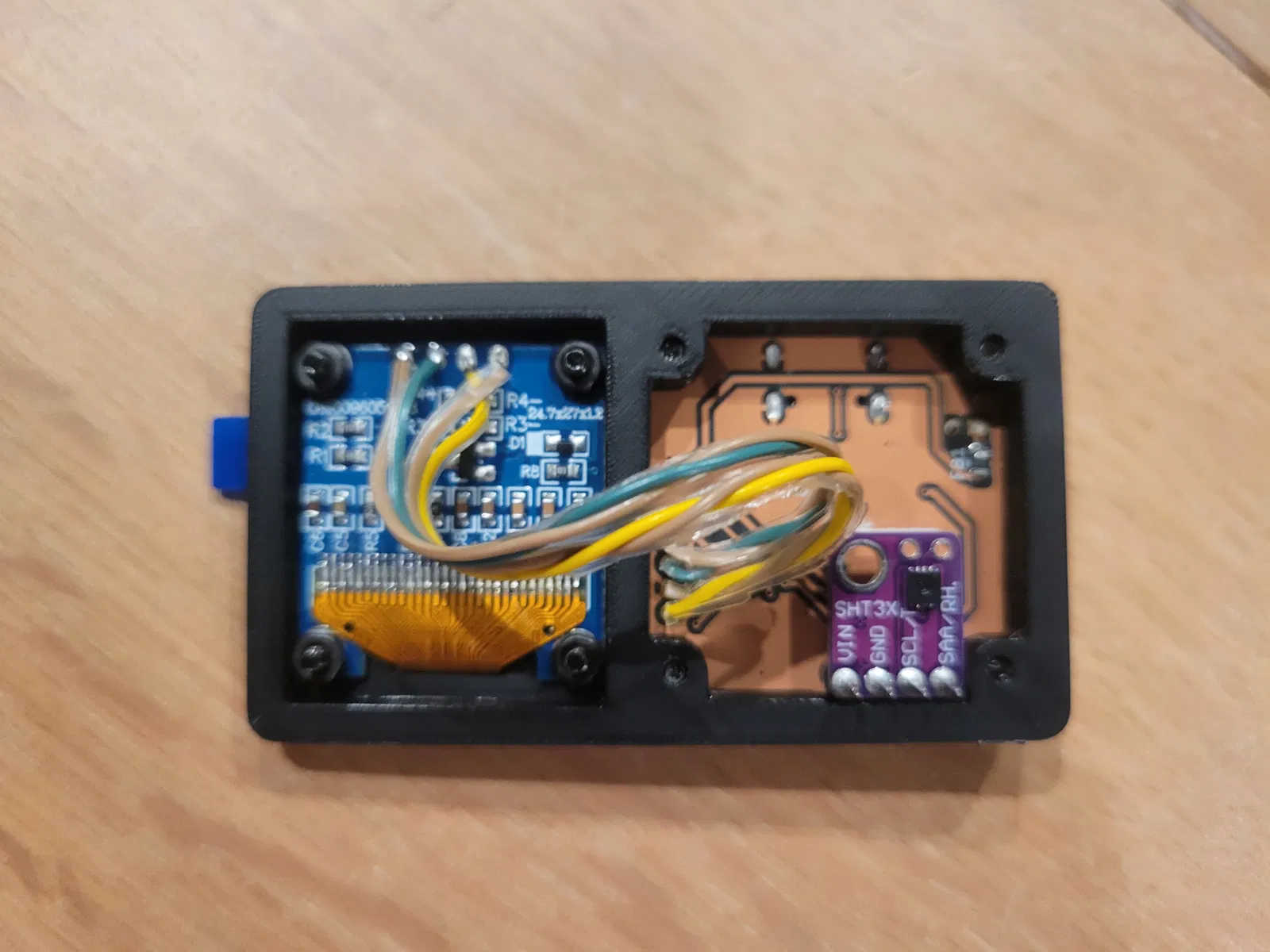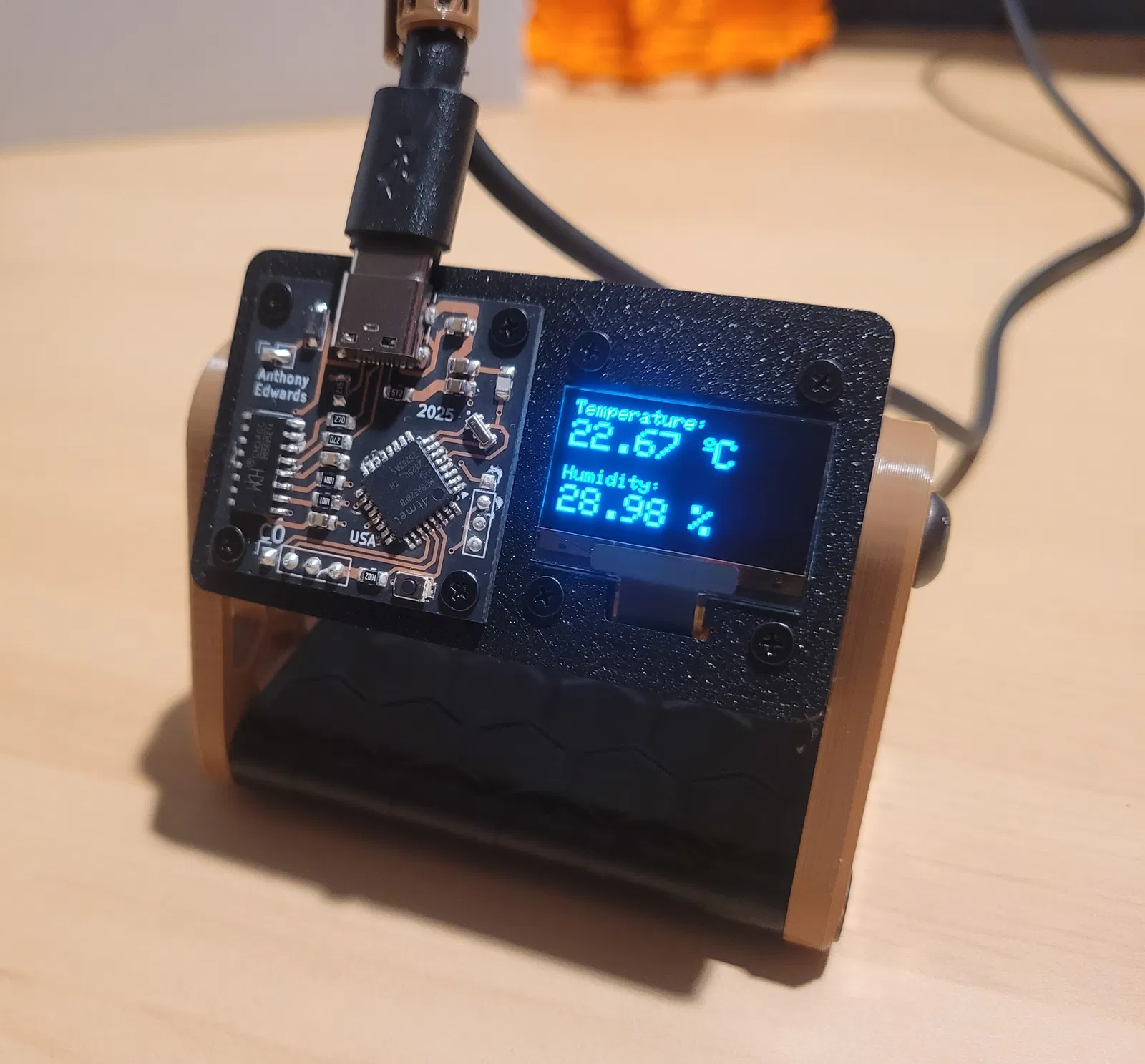 Phần vỏ được in 3D với bo mạch PCB tùy chỉnh bên trong. Sử dụng chip ATmega328PB, cảm biến SHT31 và màn hình OLED nhỏ. Cấp nguồn qua cổng USB-C.