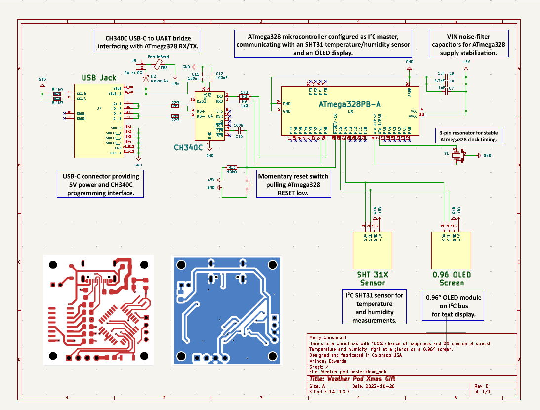 Trạm thời tiết nhỏ gọn dùng ATmega328PB, cảm biến SHT31 và màn hình OLED, được thiết kế để đặt trên bàn làm việc. Một dự án DIY tuyệt vời với vỏ in 3D và kết nối USB-C tiện lợi cho bạn.