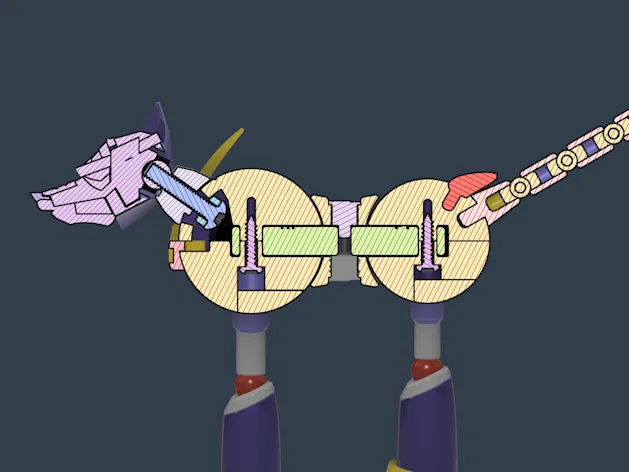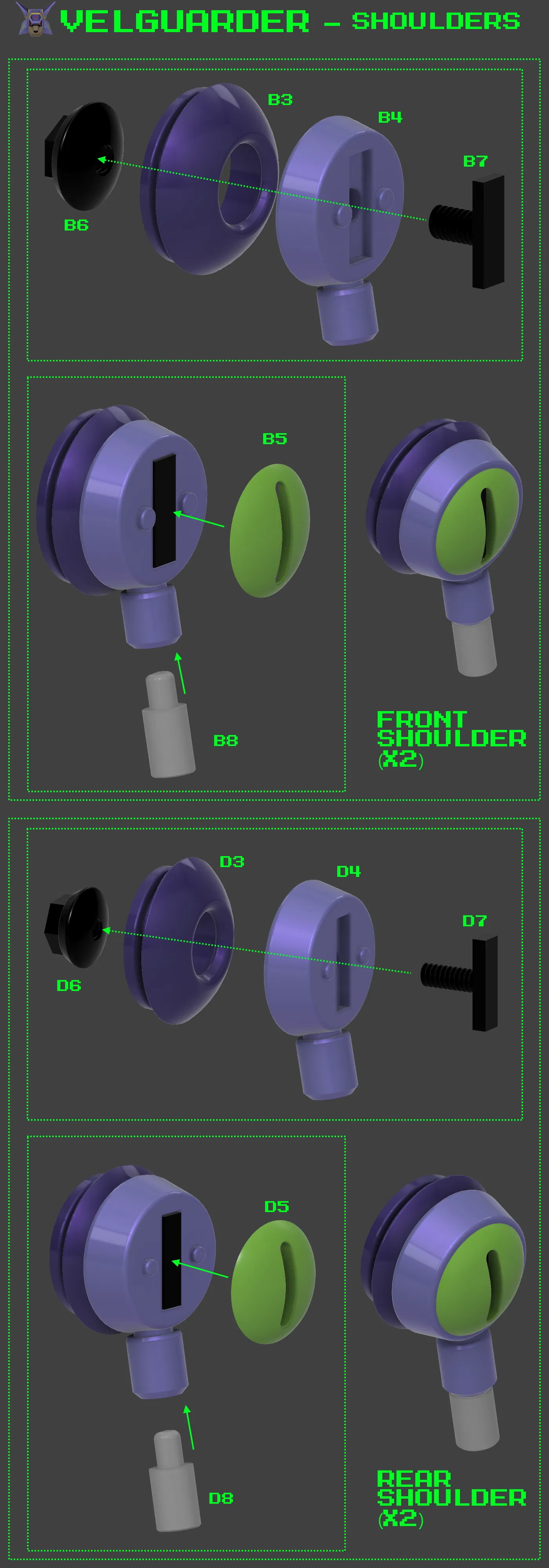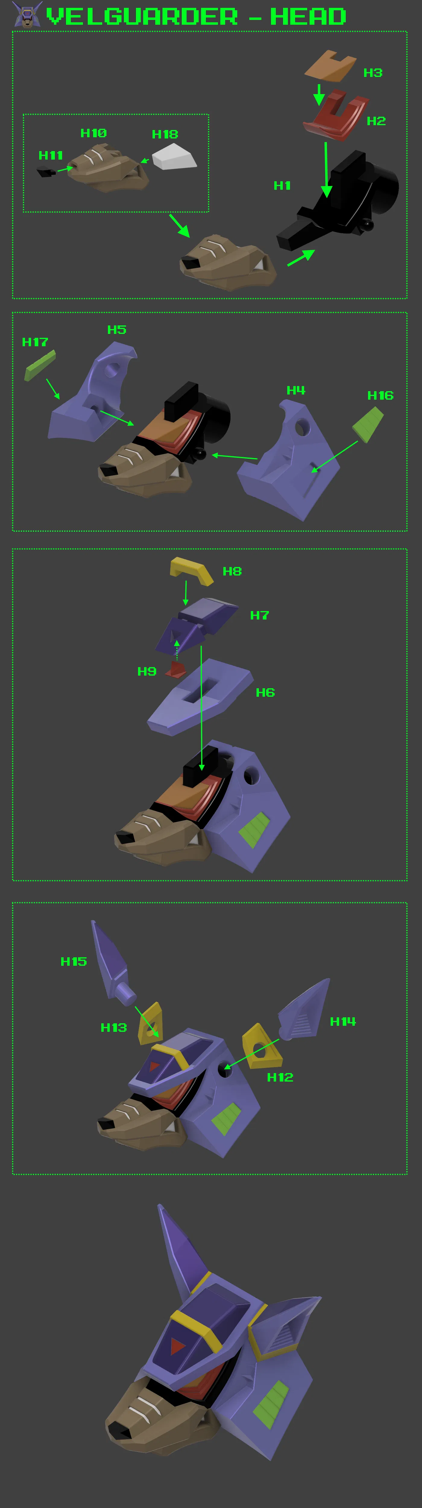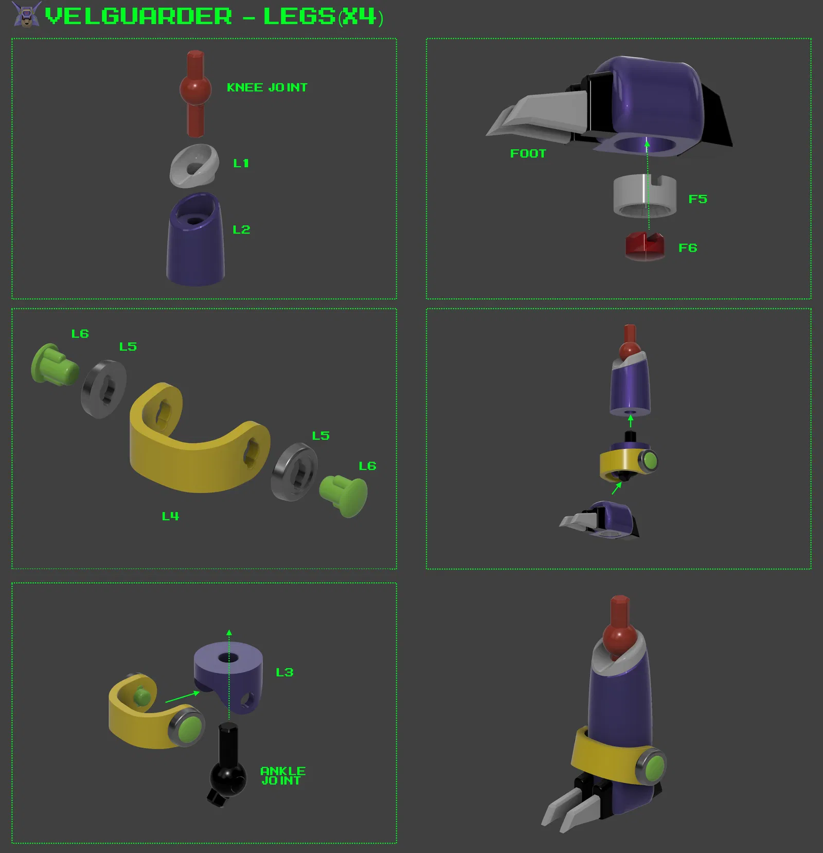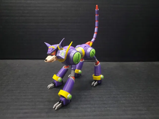 Tôi làm mô hình này để chơi cặp với mẫu Sigma của Kotobukiya khi nó được ra mắt. ### Cách tôi thiết kế mô hình này Đầu tiên, tôi thiết kế phần vai có thể điều chỉnh được. Nó sử dụng cơ chế tương tự như cần điều khiển analog. Phần đầu là khó nhất, đặc biệt là đôi tai khiến tôi rất vất vả. Tôi đã phải làm việc qua lại giữa Fusion 360 và SketchUp nên các chi tiết không được mượt mà bằng phần còn lại của mô hình. Bản nháp đầu tiên bị quá khổ, nên tôi đã vẽ lại toàn bộ ở kích thước nhỏ hơn để đảm bảo tỷ lệ. Do đó, một số chi tiết nhỏ hơi khó in tách màu. Riêng phần chân khá khó, nên thay vì tách màu, tôi sử dụng tính năng thay đổi màu theo lớp (layer changes) trong slicer và đặt chi tiết theo chiều dọc để đạt hiệu quả tương tự trên máy in một màu. Nếu bạn xem hình minh họa của Velguarder, phần đầu gối có thể cong bình thường hoặc ngược. Tôi đã làm cho mô hình có thể mô phỏng cả hai kiểu bằng cách xoay chân 180 độ và lật bàn chân lại cho khớp, như trong ảnh đầu tiên ở chân trước bên trái. ### Màu sắc đã sử dụng Dưới đây là các màu tôi đã dùng cho bản in của mình. Bạn không nhất thiết phải dùng đúng loại này, nhưng có thể tham khảo: Hobby Lobby Purple PLA Matter Hackers Build Series Silky Gold PLA Matter Hackers Build Series Silky Silver PLA Matter Hackers Build Series Red PLA (Khuyên dùng PETG) Matter Hackers Build Series Yellow PLA Matter Hackers Build Series Lime Green PLA Matter Hackers Build Series Silver PETG Các phần màu tím còn lại tôi sơn bằng màu acrylic Tamiya Purple trộn với bạc. ### Linh kiện cần thiết / Tùy chọn 2x vít 4 x 12" (hoặc tương đương) 1x vít 8-32 3/4" Tuốc nơ vít nhỏ Kìm mũi nhọn * Keo dán sắt ### Hướng dẫn lắp ráp ##### Phần 1. Cái đầu Tôi đã đính kèm phiên bản một mảnh để in dễ dàng, nhưng bạn phải tự sơn. Nếu muốn thử bản tách màu, hãy làm như sau: 1. Lắp H18 vào H10 2. Lắp H11 vào H10 3. Lắp cụm linh kiện từ bước 1 và 2 vào phần hộp sọ H1 4. Lắp H2 vào H1 (có thể dùng keo để cố định) 5. Lắp H3 vào H1 (có thể dùng keo để cố định) 6. Lắp H16 vào H4 7. Lắp H17 vào H5 8. Nối H4 và H5 vào hai bên hộp sọ 9. Lắp H6 vào cụm hộp sọ 10. Lắp H8 vào phần vương miện H7 11. Lắp H9 vào cụm vương miện 12. Gắn cụm vương miện lên hộp sọ 13. Trượt H12 vào tai H14 14. Trượt H13 vào tai H15 15. Gắn hai tai vào hộp sọ ##### Phần 2. Các khớp nối 1. Lắp E2 vào E3. Lặp lại cho đủ 4 khớp cổ chân 2. Lắp E1 vào E2. Lặp lại cho đủ 4 khớp đầu gối 3. Lắp T1 vào T2. Lặp lại cho đủ 6 khớp đuôi ##### Phần 3: Phần vai 1. Đặt vai trước B4 lên B3 2. Đưa vít B7 vào vai B4 3. Ở mặt trong của giá đỡ vai B3, vặn B6 vào để cố định. Lưu ý: đừng vặn quá chặt hoặc quá lỏng. 4. Gắn nắp vai B5 vào 5. Lắp B8 vào lỗ vai để hoàn thiện cánh tay 6. Làm tương tự cho vai trước còn lại. Thực hiện tương tự cho phần vai sau với linh kiện D. ##### Phần 4: Thân chính Lắp nửa thân trước trước. 1. Trượt B12 vào vít 8-32 3/4" như hình. 2. Đưa vít vào B1 và giữ cố định. 3. Trượt phần cổ B11 vào vít và rãnh trên B1. 4. Lắp B13 vào đầu vít và vặn chặt. 5. Gắn hai cụm vai trước vào B1. 6. Cắm phần xương sống C1 vào chốt trên B1. 7. Lắp B2 vào đáy B1. 8. Dùng vít 4 x 12" để cố định nửa trước. 9. Che lỗ vít bằng B9. Lắp nửa sau D tương tự. ##### Phần 5: Chân và bàn chân 1. Lắp nắp đầu gối L1 vào ống chân L2. 2. Lắp cụm khớp đầu gối vào chân. 3. Lắp cụm khớp cổ chân vào L3. 4. Nối các phần lại với nhau. 5. Lắp chốt cổ chân bằng cách đưa L6 vào L5. 6. Lắp chốt vào thanh cổ chân L4. 7. Lắp bàn chân bằng cách in thay đổi màu theo lớp trong slicer. ##### Phần 6: Cái đuôi 1. Nối các khớp đuôi vào T3. 2. Lắp phần đầu đuôi T4 vào T3. ##### Phần 7: Lắp ráp hoàn thiện 1. Cắm 4 chân vào thân chính. 2. Cắm đuôi vào. 3. Cắm vòng cổ B10 vào thân. 4. Cắm đầu vào. Velguarder đã hoàn thành! ### Lời kết Nếu bạn in mô hình này, hãy đăng ảnh thành quả nhé, tôi rất muốn thấy chúng trông thế nào.