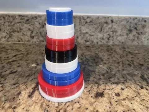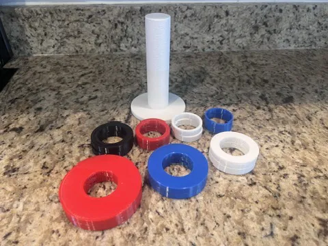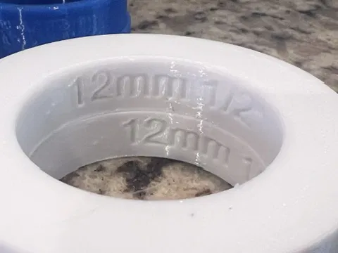 Bộ vòng đệm canh độ dày cho cây cán bột (French rolling pin/cây lăn bột dạng thanh). Lỗ chính giữa có đường kính 36,5 mm. Các vòng đệm có độ dày lần lượt là 2, 4, 6, 10, 12, 18 và 26mm. Thiết kế tháp xếp chồng giúp cất giữ gọn gàng, và thông số độ dày được khắc chìm ở mặt trong của vòng. Mình tạo mô hình này theo thông số (parametric), nên nếu bạn muốn chỉnh kích thước hình tròn tiêu chuẩn thì tất cả các chi tiết khác cũng sẽ tự động thay đổi theo. Lưu ý là phần chữ khắc chìm được thực hiện trong phần mềm slicer, nên nếu thay đổi kích thước thì phần chữ này sẽ mất đi. Mình đã in bằng nhựa PETG (bạn dùng PLA vẫn ổn), thông số in là 2 lớp vỏ (double walls) và độ lấp đầy (infill) 50%.