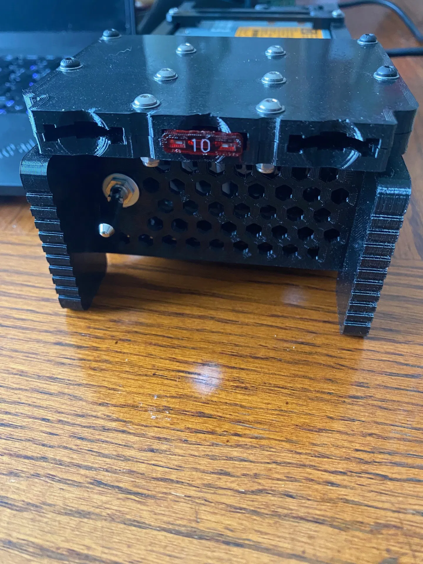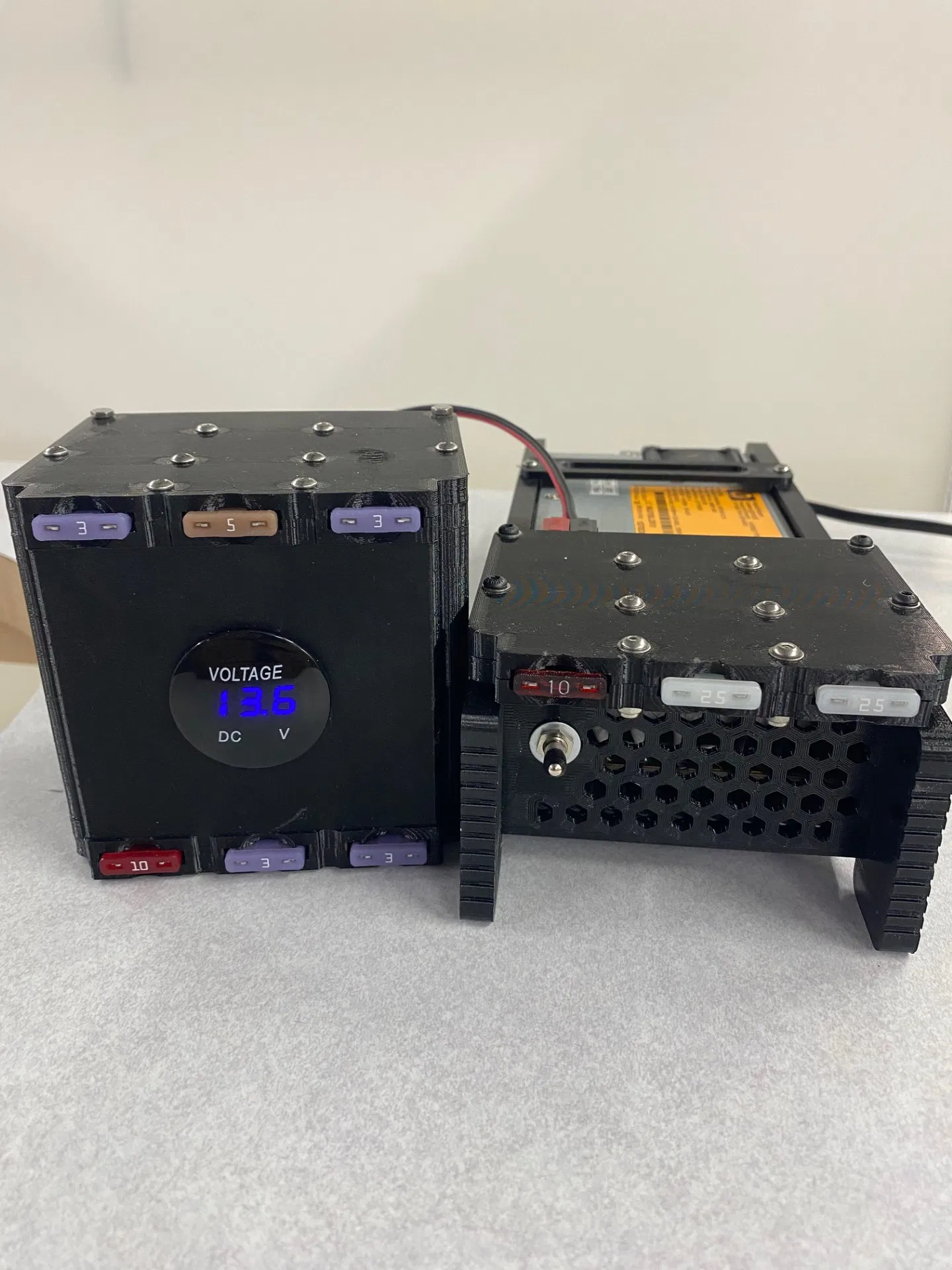 Thiết bị này dùng cầu chì ATC. Vì tôi chỉ dùng khối này cho các phụ kiện như đèn nền SWR, công tắc ăng-ten, v.v., tôi lắp cầu chì 10A đầu vào và cầu chì dưới 5A đầu ra tùy thiết bị. Bất kỳ vị trí nào cũng có thể làm đầu vào miễn là được gắn cầu chì đúng cách. Tôi dùng hai đầu ra có cầu chì còn lại trên bộ nguồn cho các thiết bị chính tiêu thụ điện cao hơn.