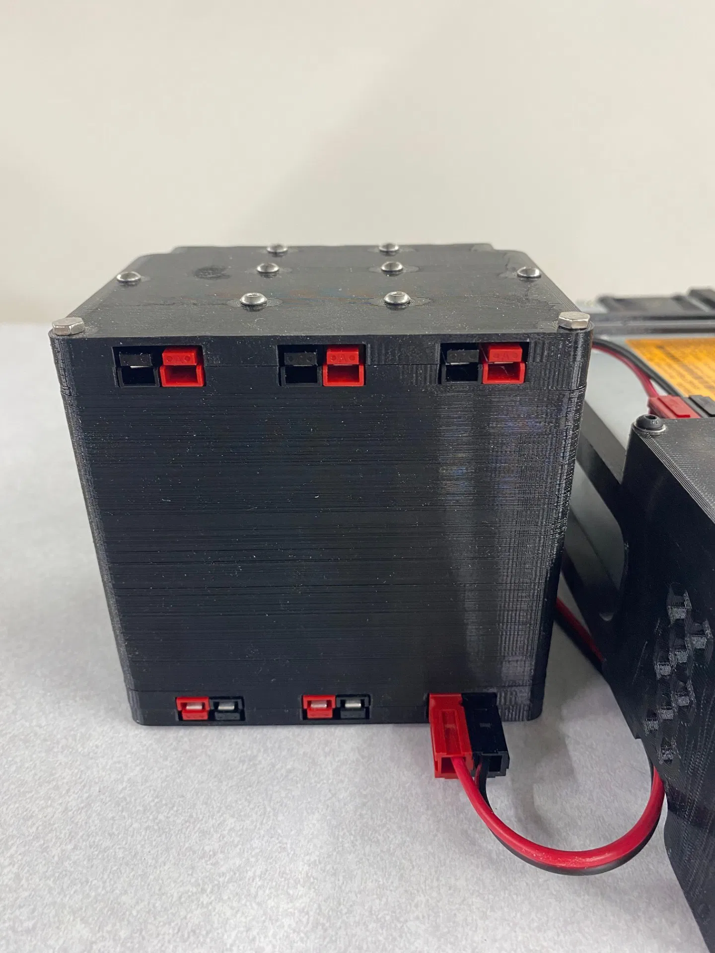 Cần lưu ý các thanh cái có độ lệch phải đặt theo hướng cụ thể. Khi nhìn từ phía trước, dây từ thanh cái dương phải đi sang phía bên phải của mỗi cầu chì, và dây âm phải đi sang phía bên phải của giắc Anderson Power Pole/đầu nối đen. Khoảng cách từ dây trái/đầu cầu chì đến giắc Power Pole đỏ cực kỳ quan trọng. Tôi khuyên bạn nên bấm đầu cốt 30 amp Power Pole, lắp vào vỏ đặt sẵn trong hộp dưới, rồi đặt đầu cốt âm (female spade terminal) vào đúng vị trí để đo và cắt dây. Chỉ cần sai một chút là không lắp được. Tôi dùng đầu cốt âm Thomas and Betts 14-16 gauge, tháo bỏ lớp bọc cách điện và dùng kìm bấm cốt chất lượng tốt thay vì loại kìm thép dập rẻ tiền dễ làm nát đầu cốt. Tôi có chỉnh lại đầu cốt sau khi bấm vì không gian lắp khá chật. Sự khít khao này là cần thiết để giữ đầu cốt cố định khi cắm cầu chì vào. Hình ảnh này lấy từ bộ nguồn nhưng cách đi dây ở các phần cầu chì/Power Pole là giống hệt. Bạn có thể chồng nhiều tầng lên nhau nếu muốn thêm mạch với vít dài hơn, nhưng không gian sẽ trở nên rất chật.