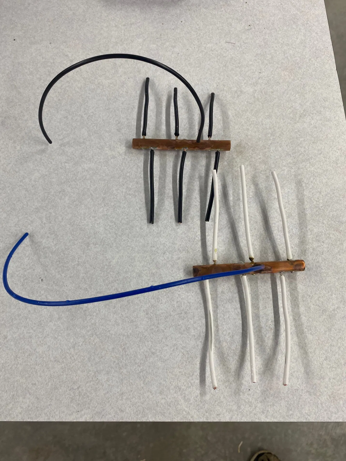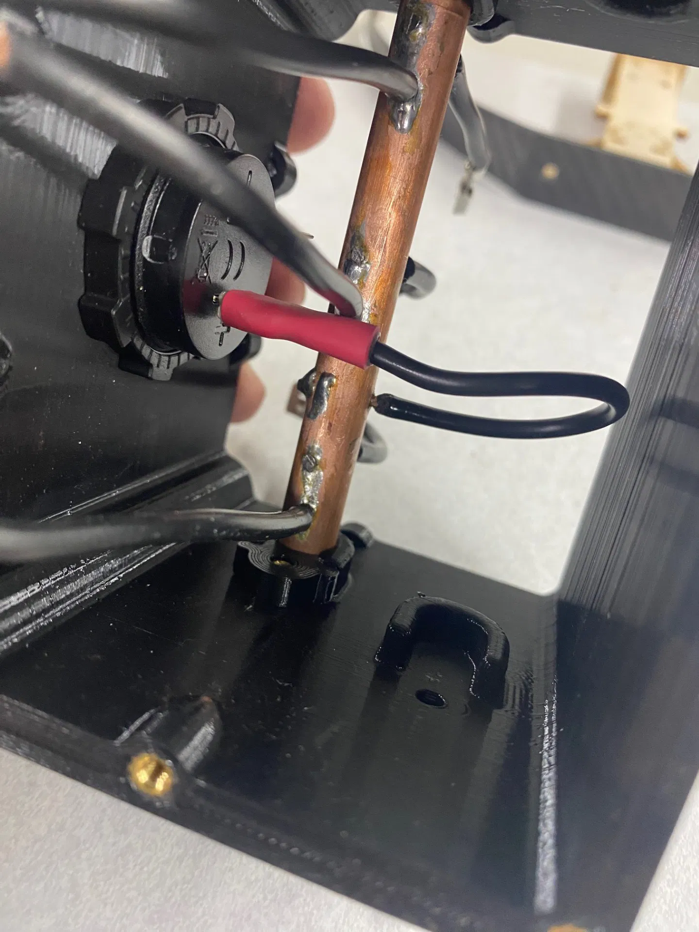 Phần khối trên và dưới của mô hình này dựa trên các khối phân phối nguồn của tôi. Nó không được thiết kế cho tải dòng cao, mà chỉ chịu được mức tăng đột biến tối đa 20A và dòng liên tục khoảng 15A nếu dùng dây 14 gauge (lõi đa sợi). Thanh cái được dùng cùng với bộ hướng dẫn khoan để tạo lỗ hàn dây. Lỗ trong bộ hướng dẫn được làm nhỏ hơn, vì tôi dùng dây 14 gauge; nếu bạn dùng dây nhỏ hơn với công suất thấp hơn thì hãy chọn mũi khoan tương ứng. Hãy khoan đúng kích thước bộ hướng dẫn trước khi khoan ống đồng. Khi khoan, tôi vạch một đường ở giữa ống, đặt mặt đó hướng lên trên với một đầu ống nhô ra khoảng 1/8 inch (~3mm). Sau khi khoan từ cả hai phía, tôi nới vít và trượt ống ra thêm 1/8 inch, vẫn giữ nguyên vị trí vạch dấu ở góc 12 giờ. Một lỗ nhỏ bổ sung được khoan ở góc 90 độ cho dây 18 gauge để lấy nguồn 12V cho đồng hồ đo điện kỹ thuật số. Do ống đồng có khối lượng lớn, tôi đã dùng khò ga mini để hàn.