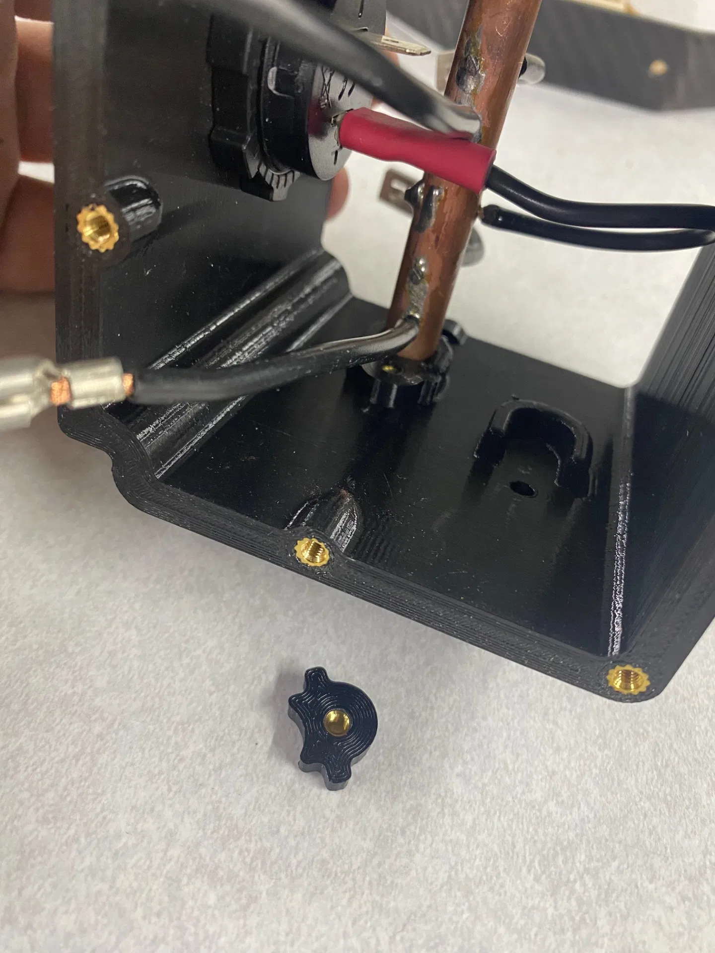 Tất cả các lỗ 4.4mm đều dùng vít cấy nhiệt M3 (heat set insert). Tôi đã đo và dùng loại này, nhưng tôi tin là các loại tương tự cũng vừa. Các vị trí cấy đều sâu tối thiểu 5mm. MẸO: sau khi cấy xong, hãy dùng một khối kim loại phẳng ấn nhẹ lên bề mặt nhựa nóng chảy xung quanh và vít cấy để làm phẳng ngay lập tức. Việc này giúp bạn không cần dùng dao, đục hay chà nhám mà vẫn có bề mặt khớp hoàn hảo.